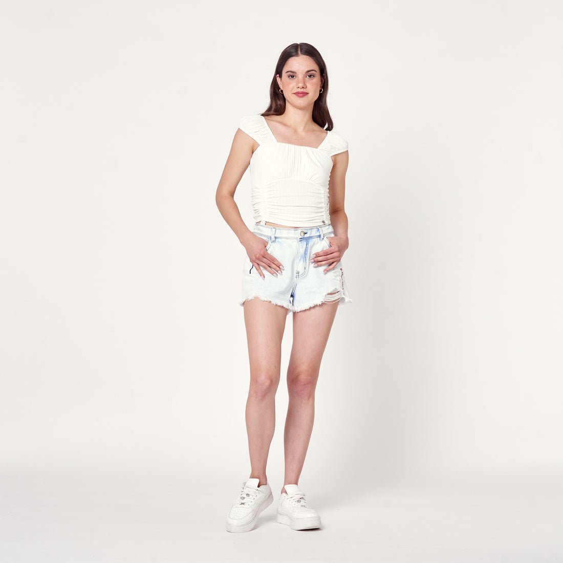 El short Zombria en denim rígido celeste es un clásico atemporal con un aire moderno....