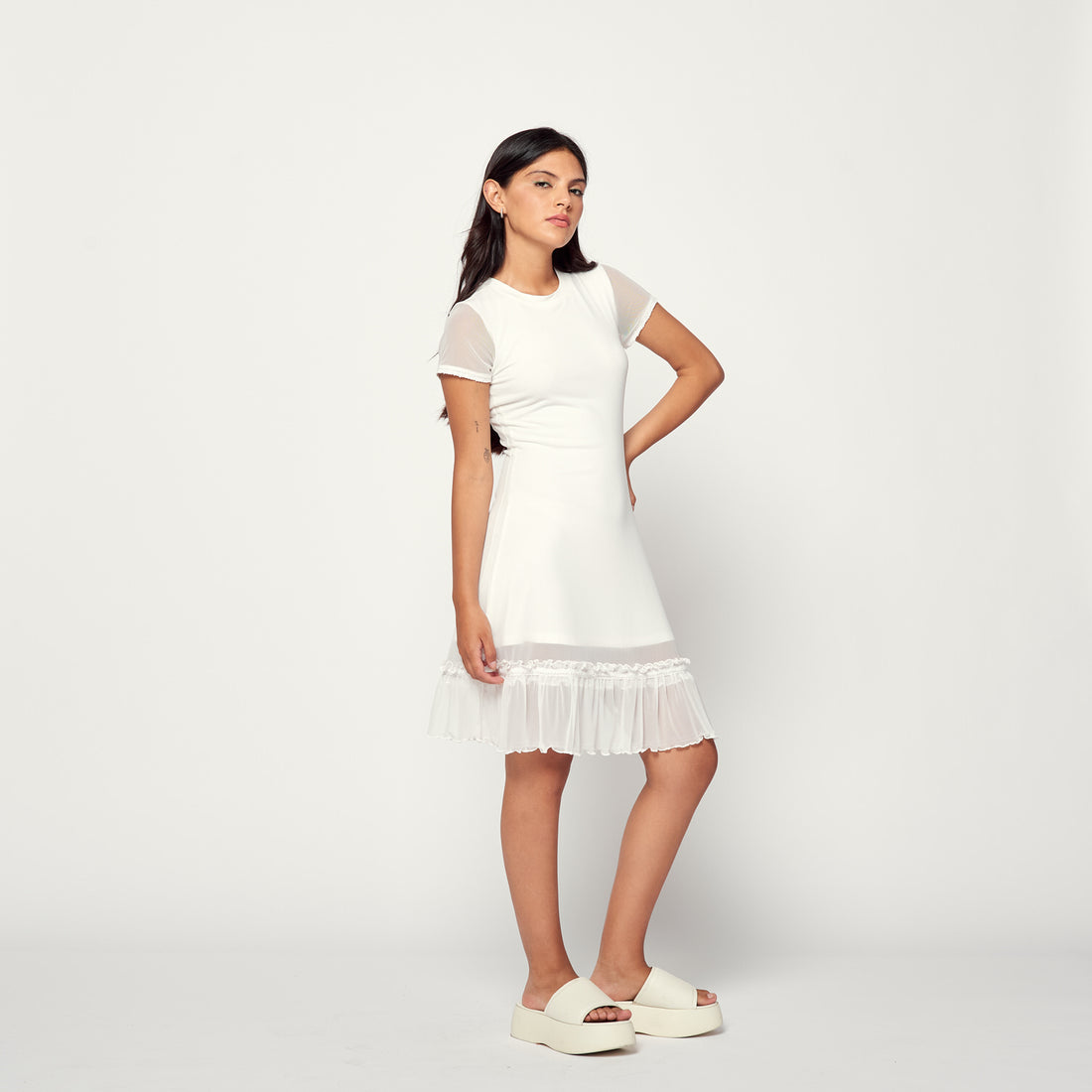 Elegante y versátil. Este vestido blanco en viscosa y mesh es perfecto para cualquier ocasión....