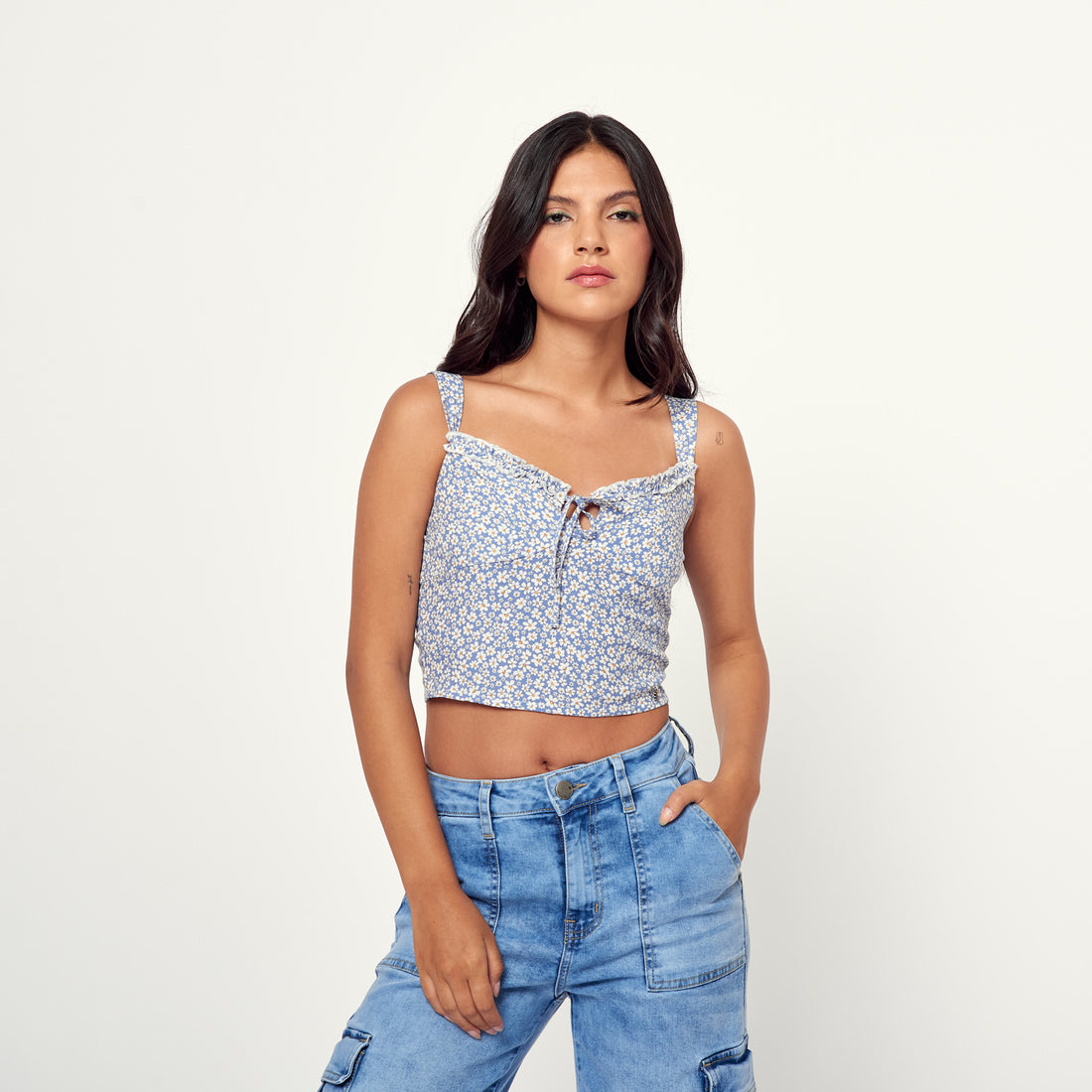 Blusa estilo corset azul con tirantes de denim que te hará marcar la diferencia Composición:...