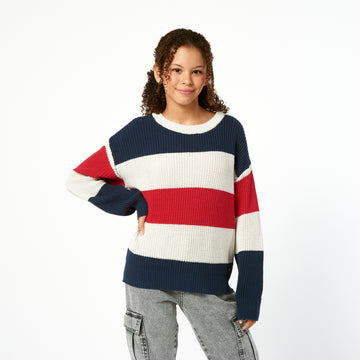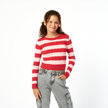 Una chompa de tejido de punto fino con un diseño de rayas horizontales. La Chompa...