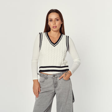 Un chaleco de tejido de punto en colores hueso con detalles en negro. El Chaleco...