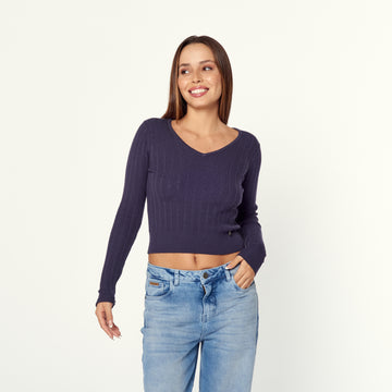 Una chompa de tejido de punto fino en color azulino con cuello en V. La...