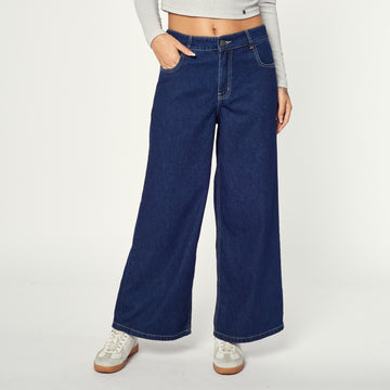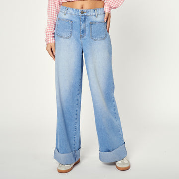 Juvenil, fresco y muy combinable. El tono celeste sobre denim rígido da ese aire casual...