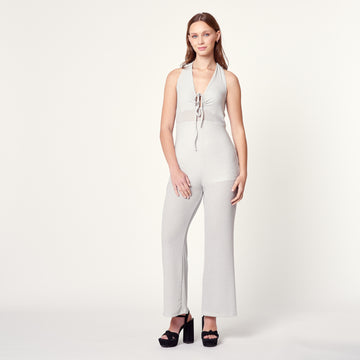 Enterizo largo plateado con detalle de lazo, elegancia veraniega minimalista para eventos especiales bajo el...