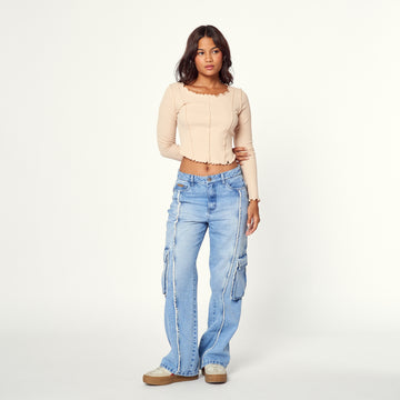 ¡Estilo cargo reinventado! El Jean Ama en denim rígido celeste tiene un diseño de corte...