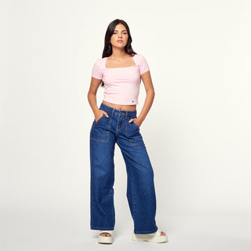 Perfecto para un look casual y relajado, este jean azul de denim rígido es súper...