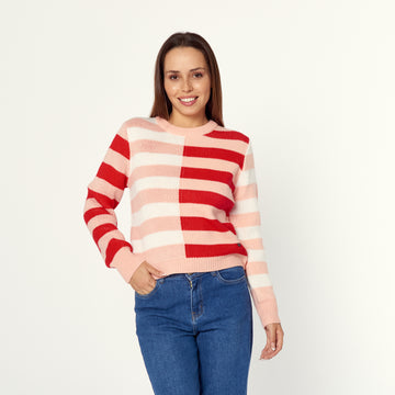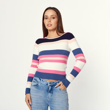 Una chompa de tejido de punto con un diseño de rayas horizontales en varios colores....