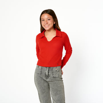 Esta blusa roja de rayon es una prenda elegante y sofisticada. Su diseño con detalle...