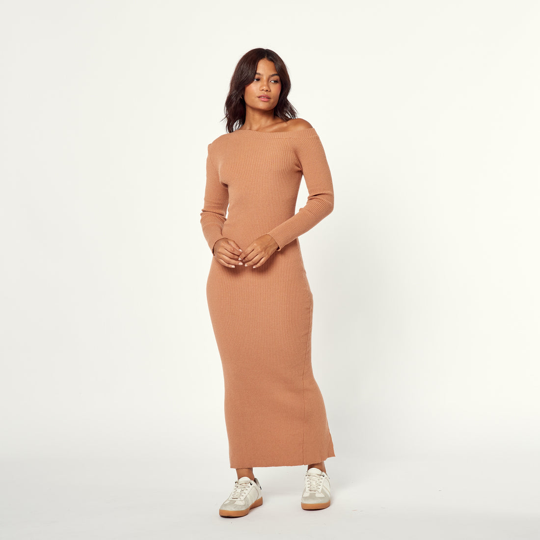 ¡Elegancia atemporal! Este vestido camel de tejido es perfecto para un look sofisticado y femenino....