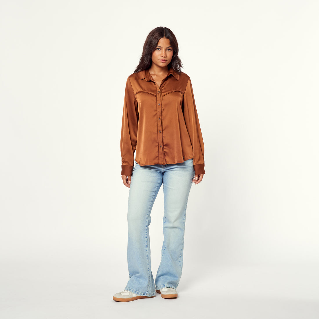 ¡Brilla con la Blusa Leticia! En satín marrón, esta blusa es perfecta para un look...