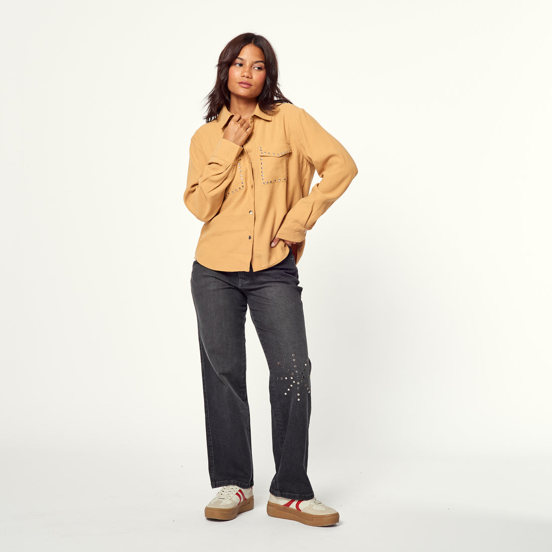 ¡Estilo western con un toque moderno! La Blusa Westerna en cuprotex color camel tiene detalles...
