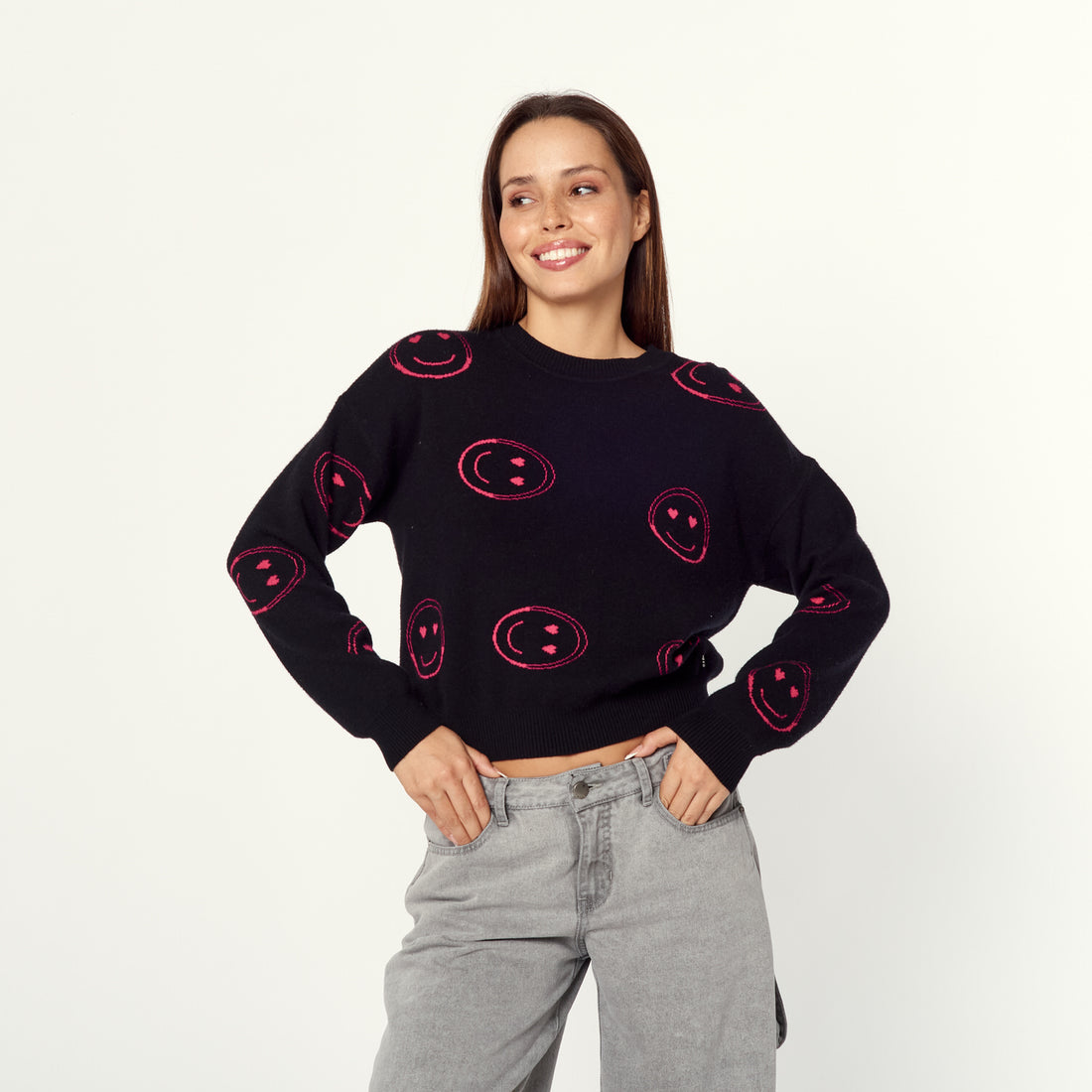 Una chompa de tejido de punto en color negro con un estampado de caritas sonrientes...