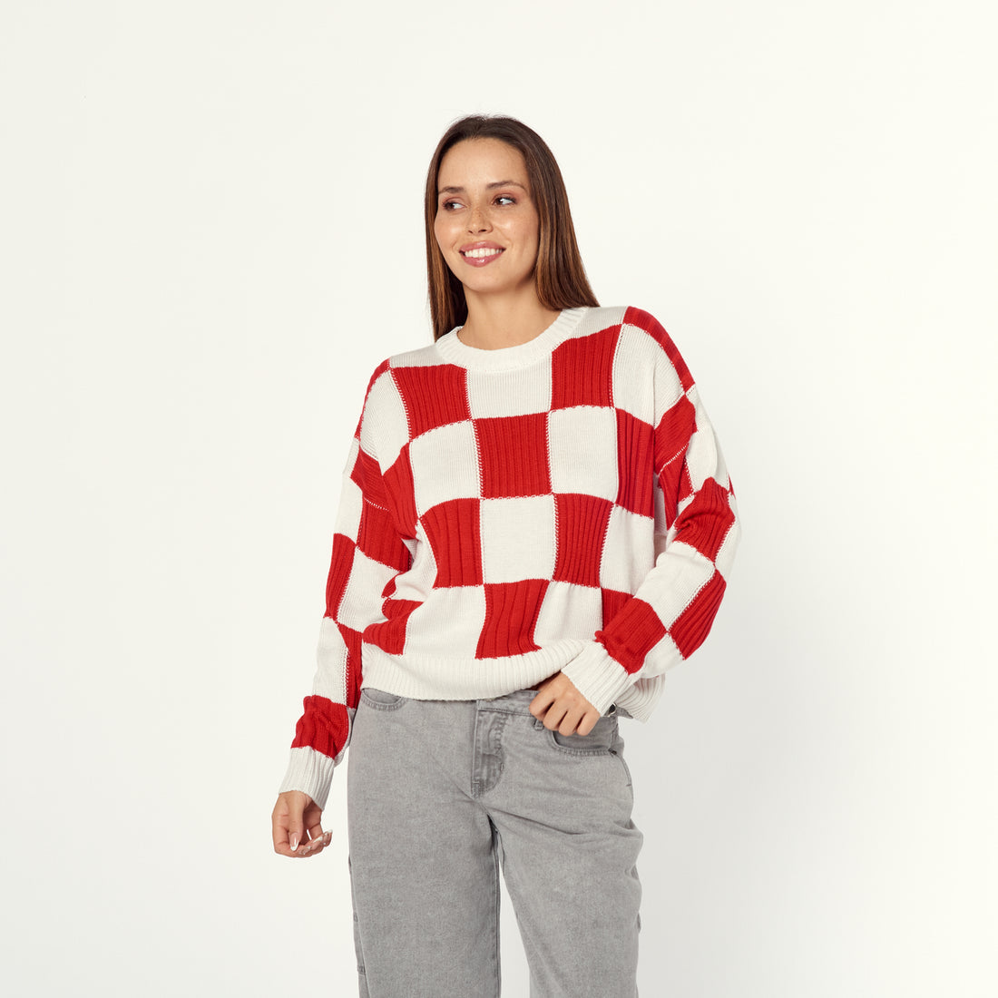 Una chompa de tejido de punto con un diseño de cuadros en múltiples colores. La...