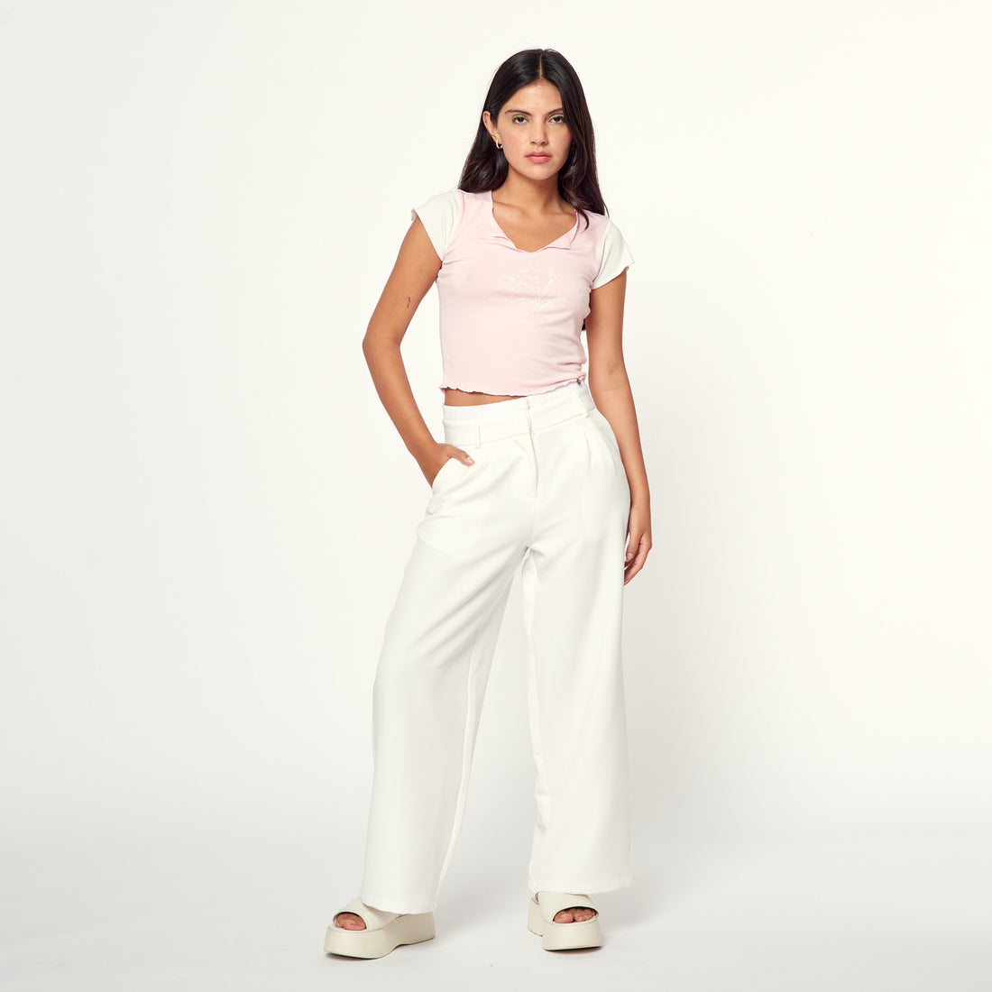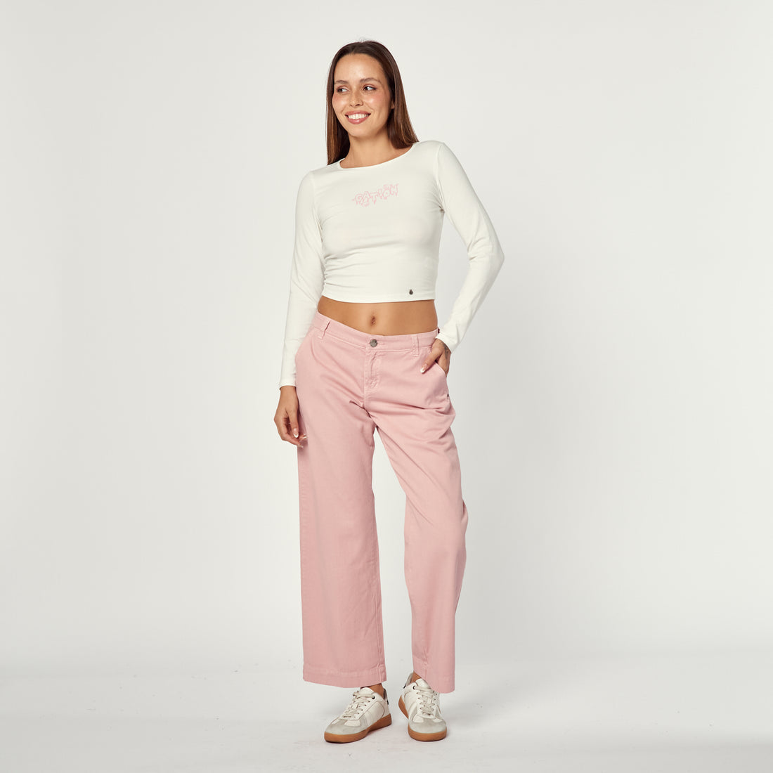 Polo manga larga hueso con estampado rosado minimalista. Un fit de jersey lycrado para combinar...
