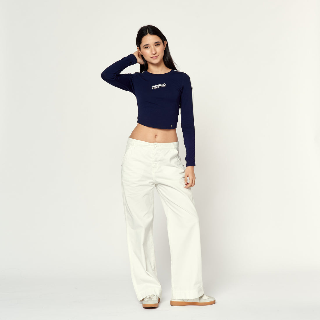 Look atrevido en contraste. Zumba color hueso en drill rígido con un corte amplio que...