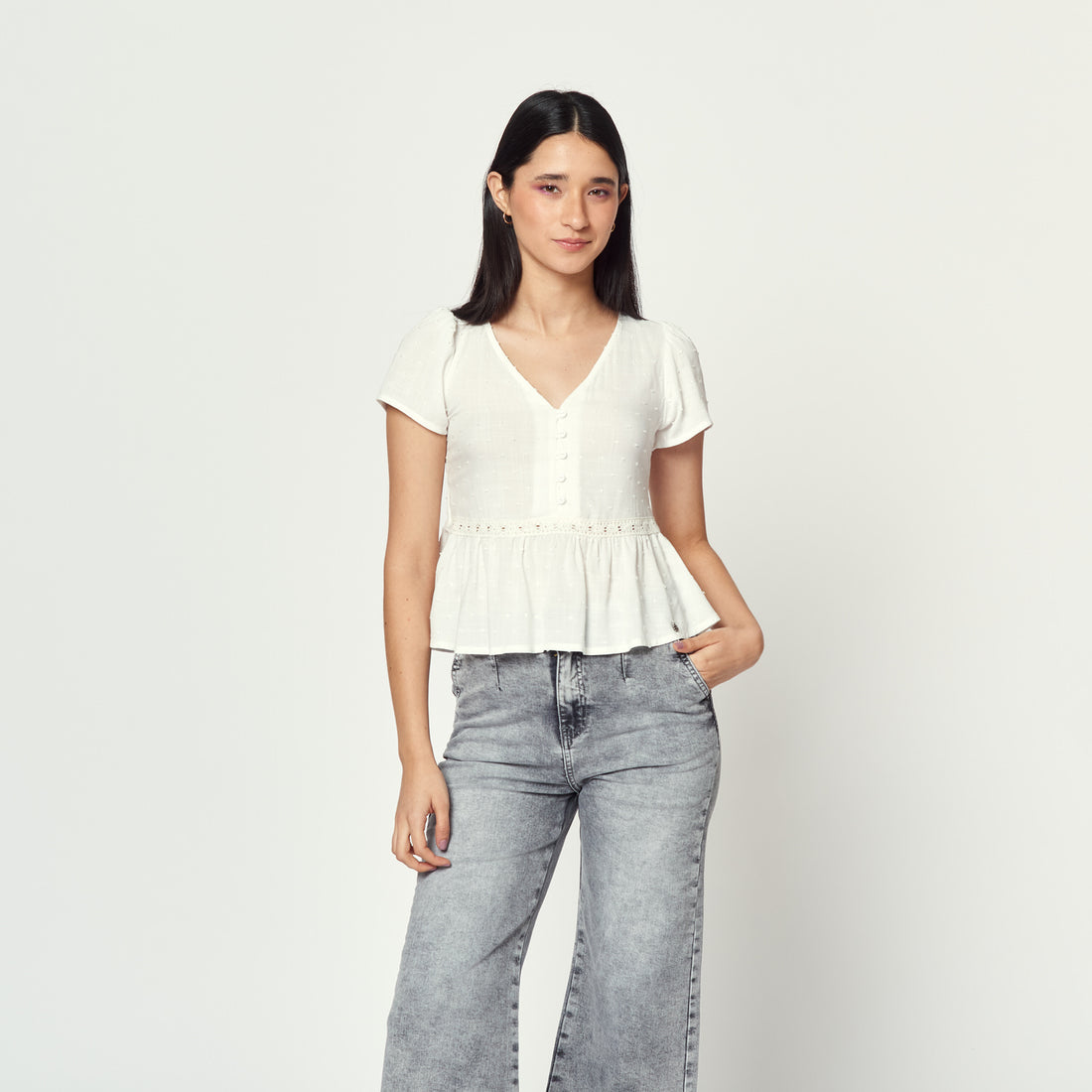 Blusa en rayón con silueta versátil. El tono hueso la hace combinable con jeans y...