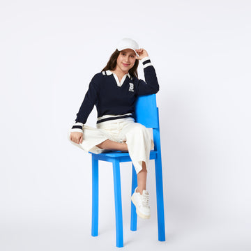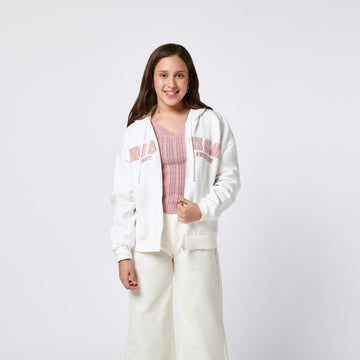 COMFY! Chompa con cuello en V, pretina y puños de rib con detalle de estampado...