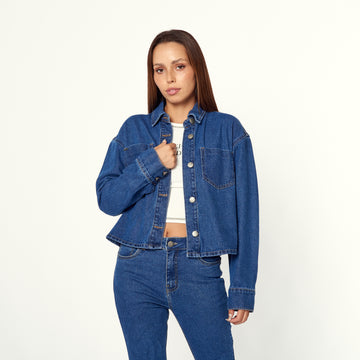 Un clásico reinventado con estilo urbano. La Casaca Alesandra en denim rígido azul es una...