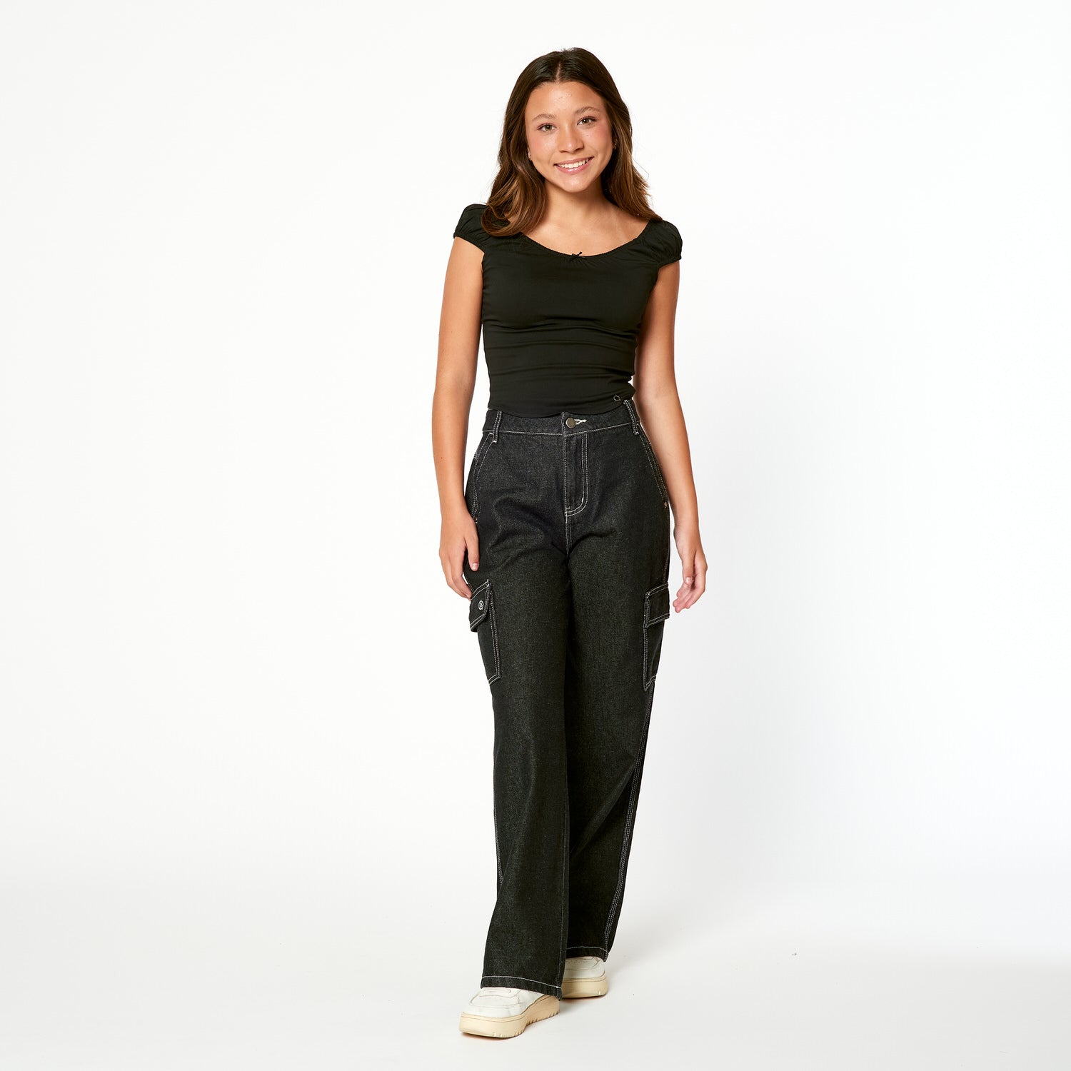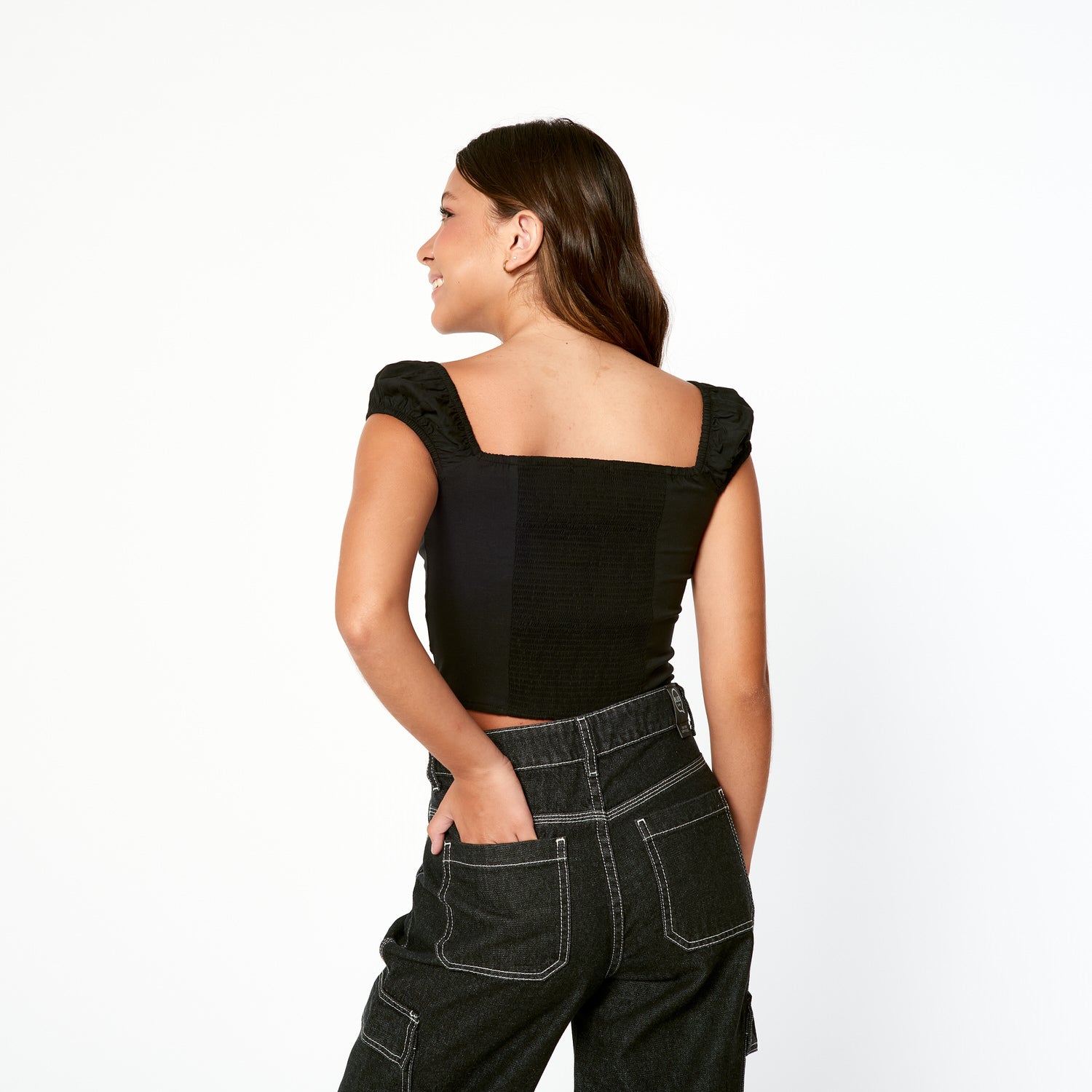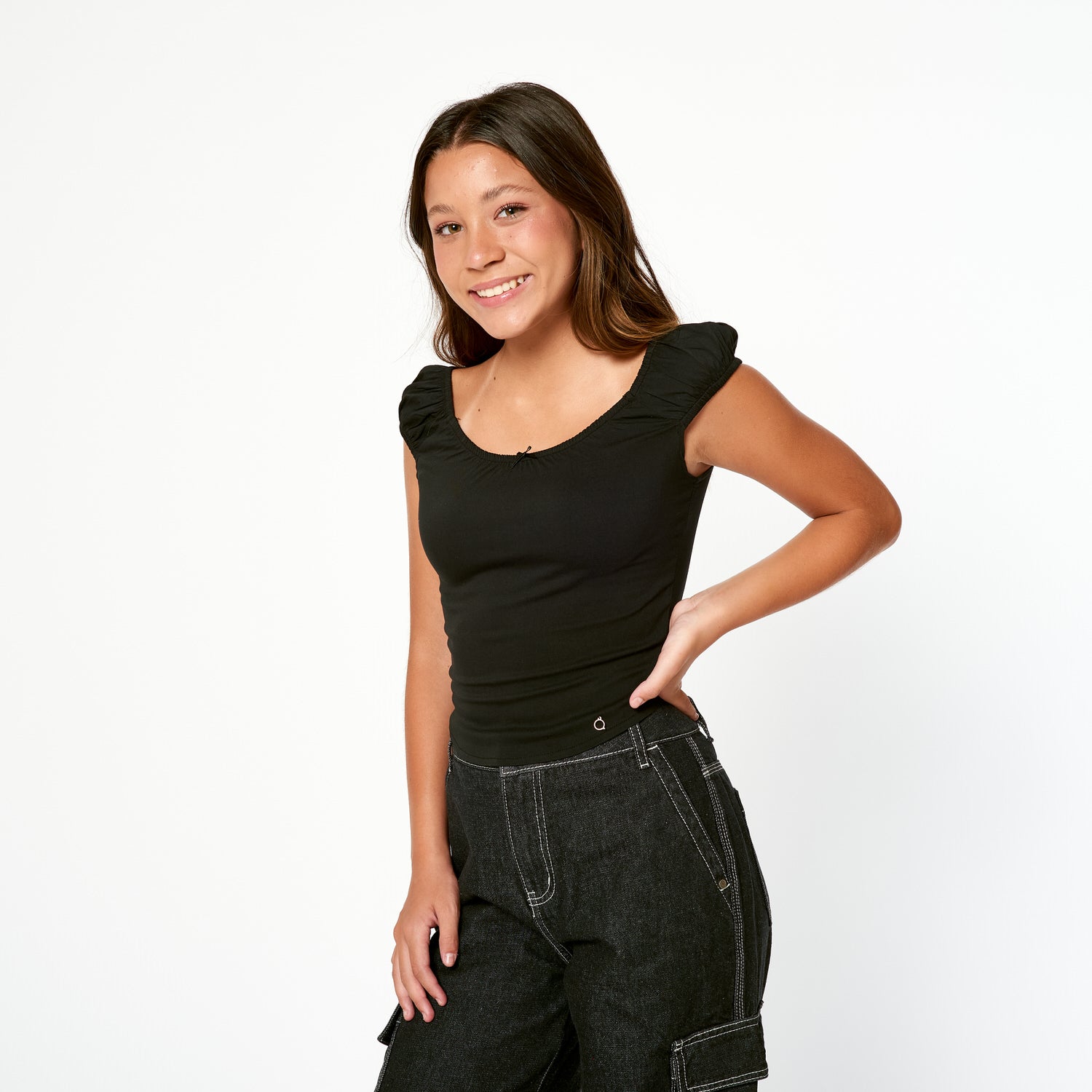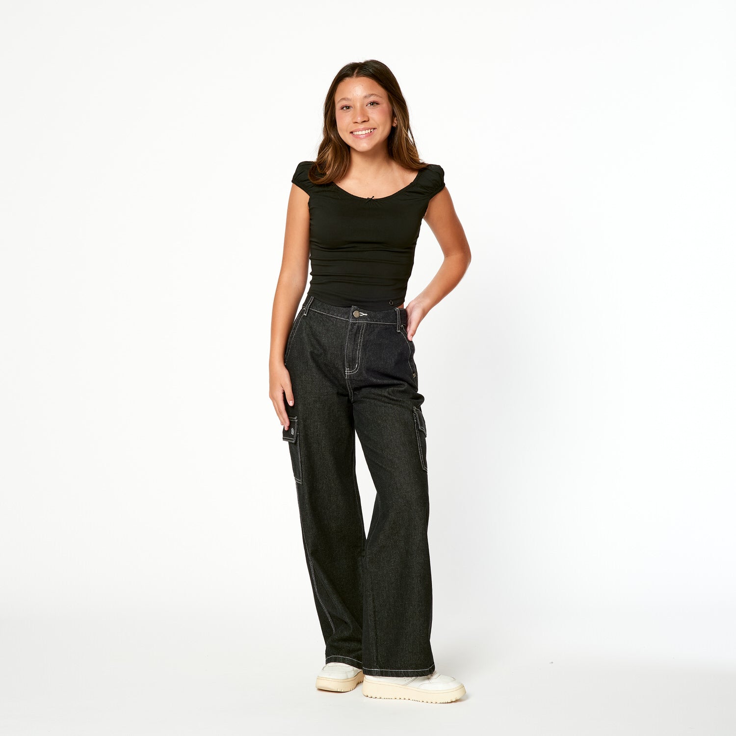 Esta blusa negra es una prenda básica y versátil que no puede faltar en tu armario. Su tejido elástico se adapta a tu figura y te brinda comodidad durante todo el día. Combínala con jeans para un look casual o con una falda lápiz para un estilo más formal.