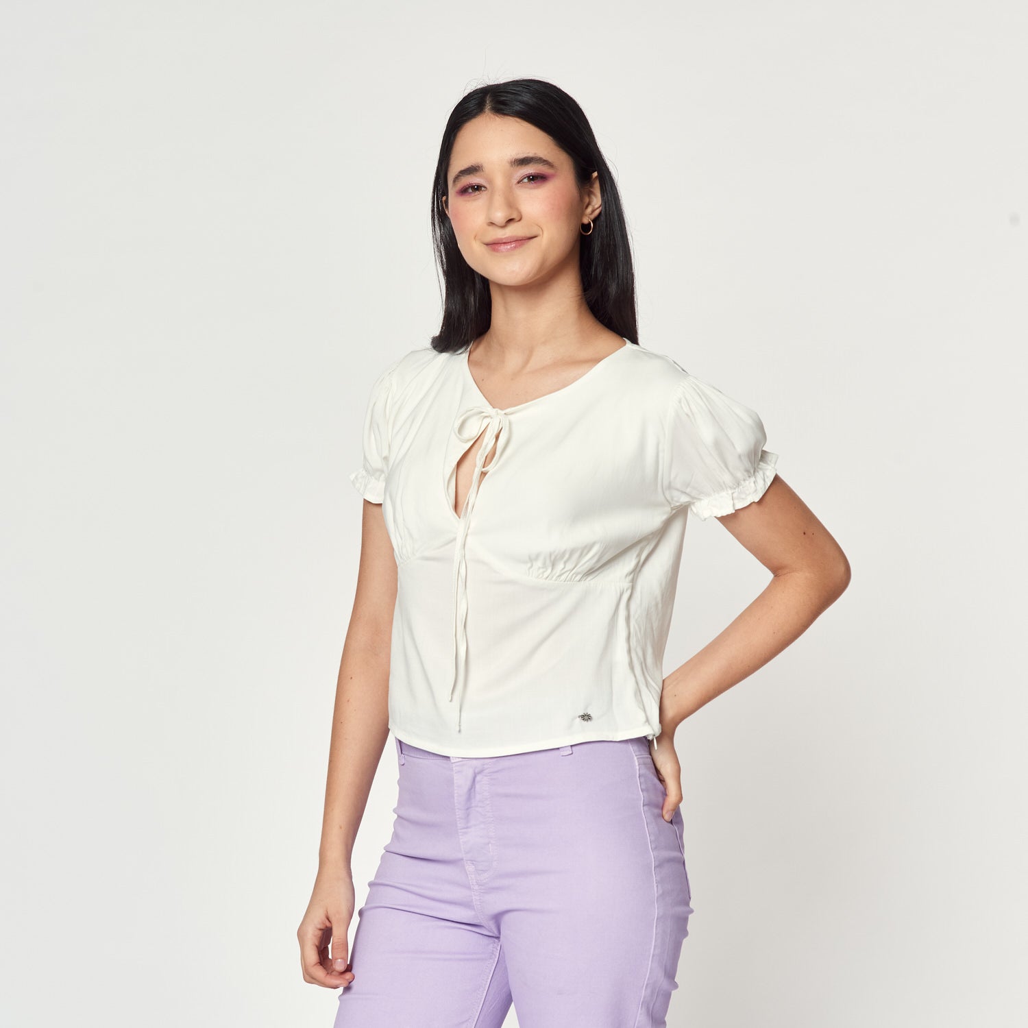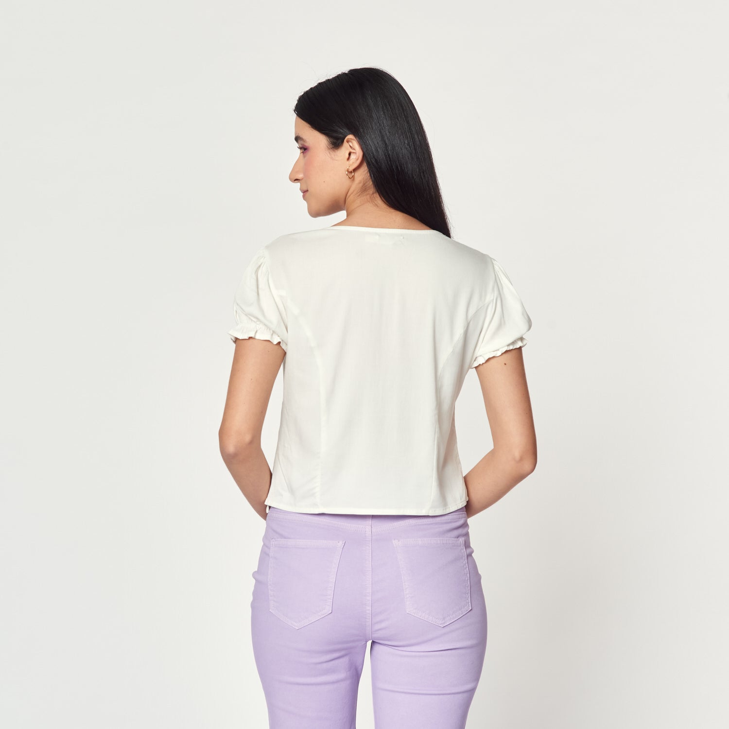 Blusa en rayón de silueta versátil. El tono hueso funciona como básico de armario, combinable con jeans o faldas para un estilo atemporal.
