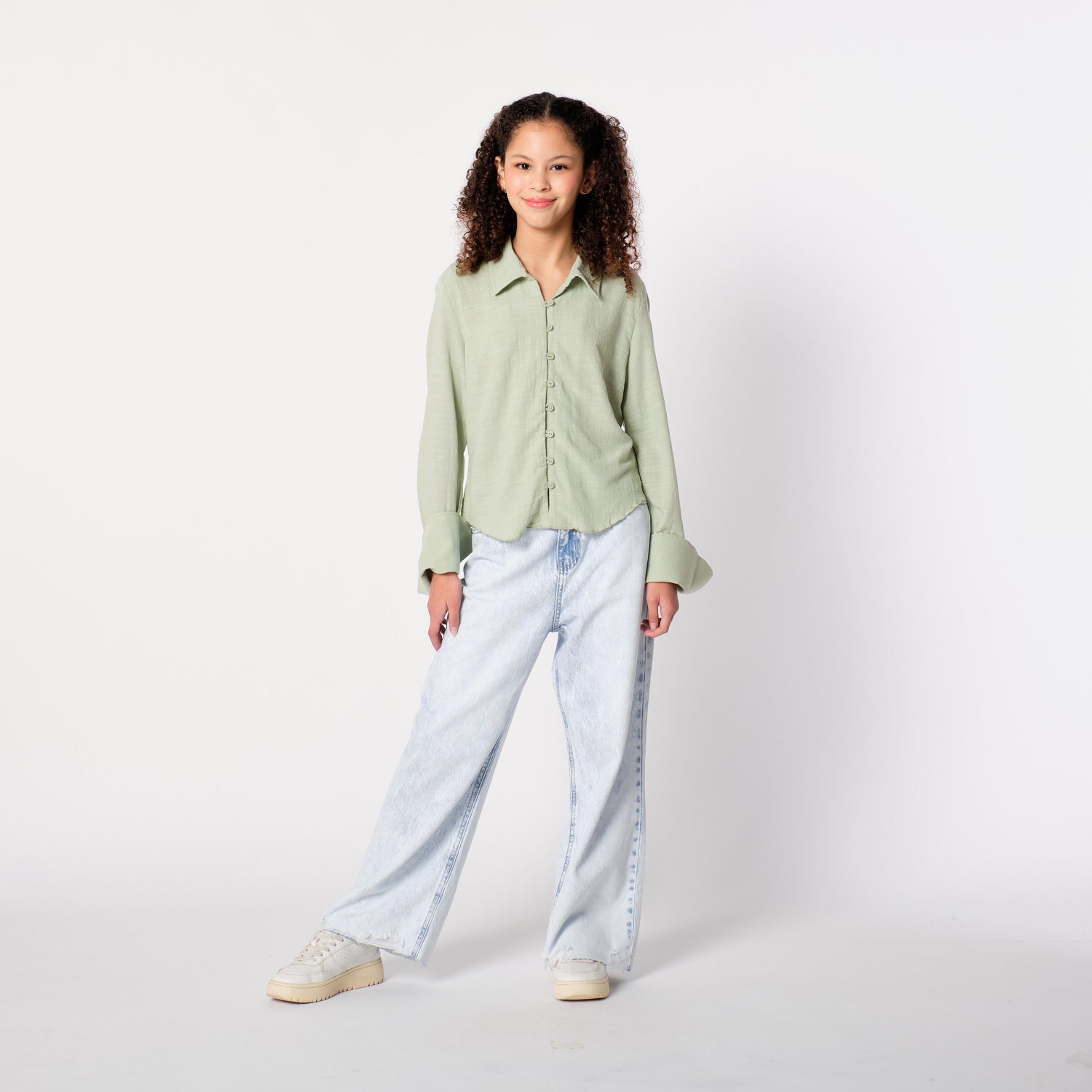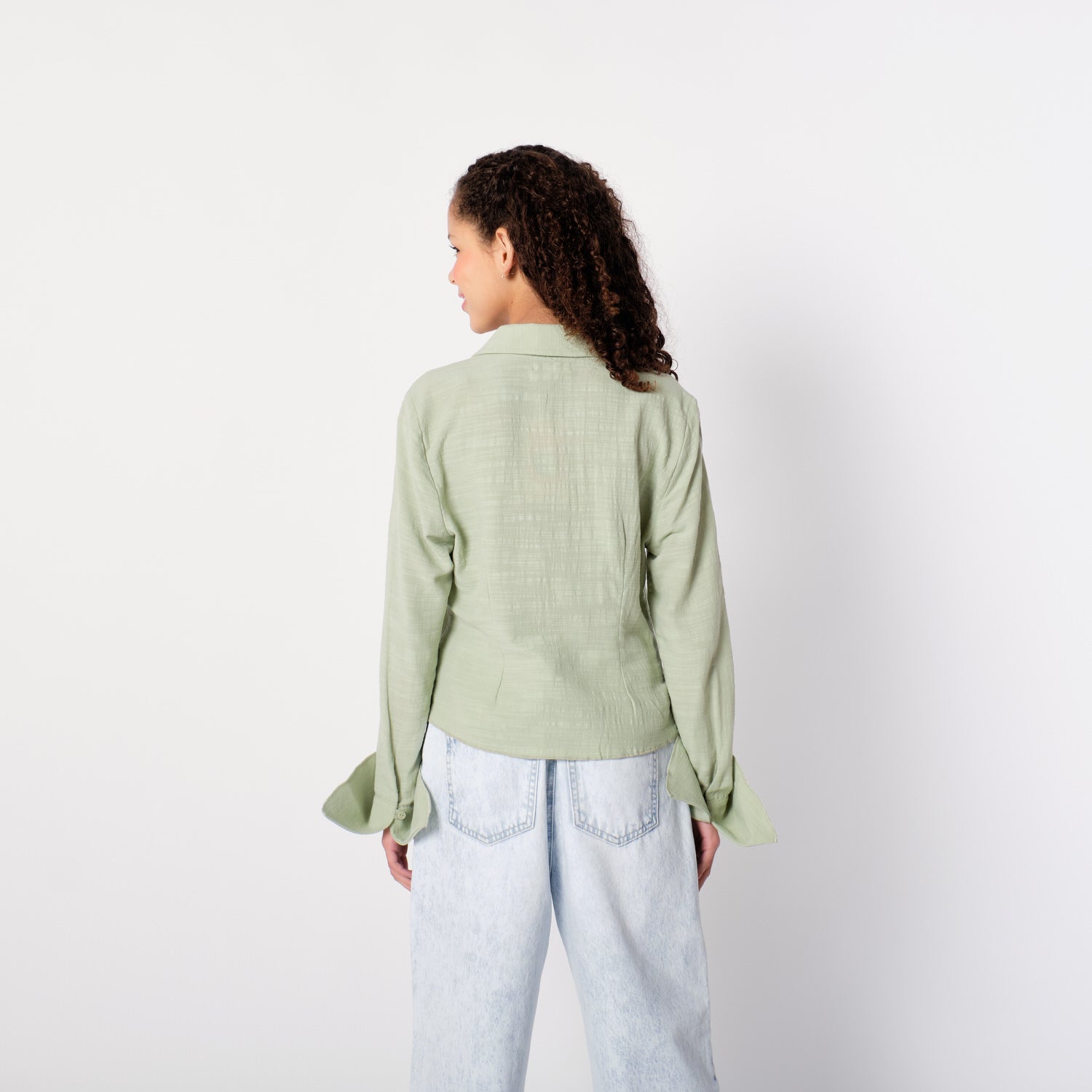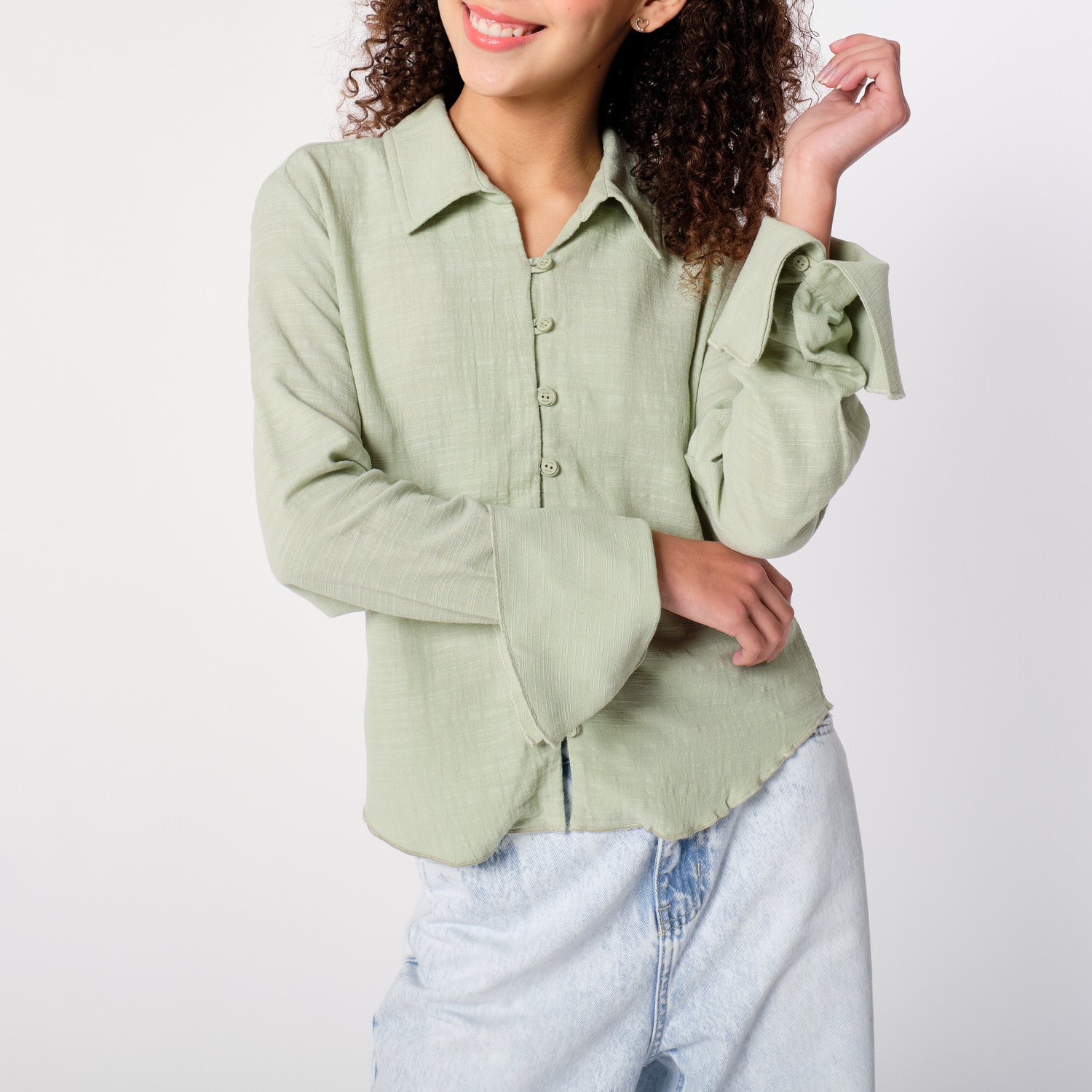 LOVE IT 🥰! Blusa manga larga con cuello camisero, botones personalizados y detalles de gurbion.