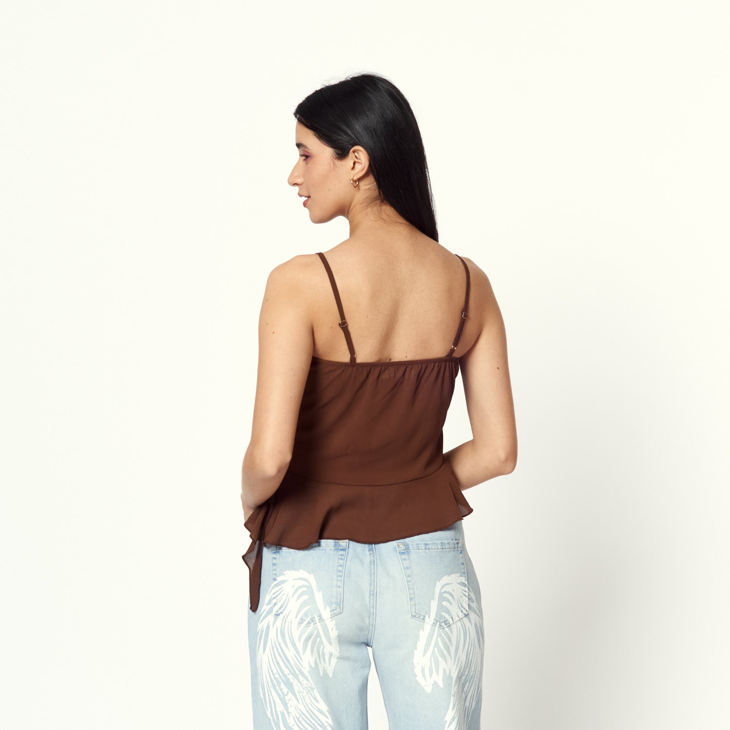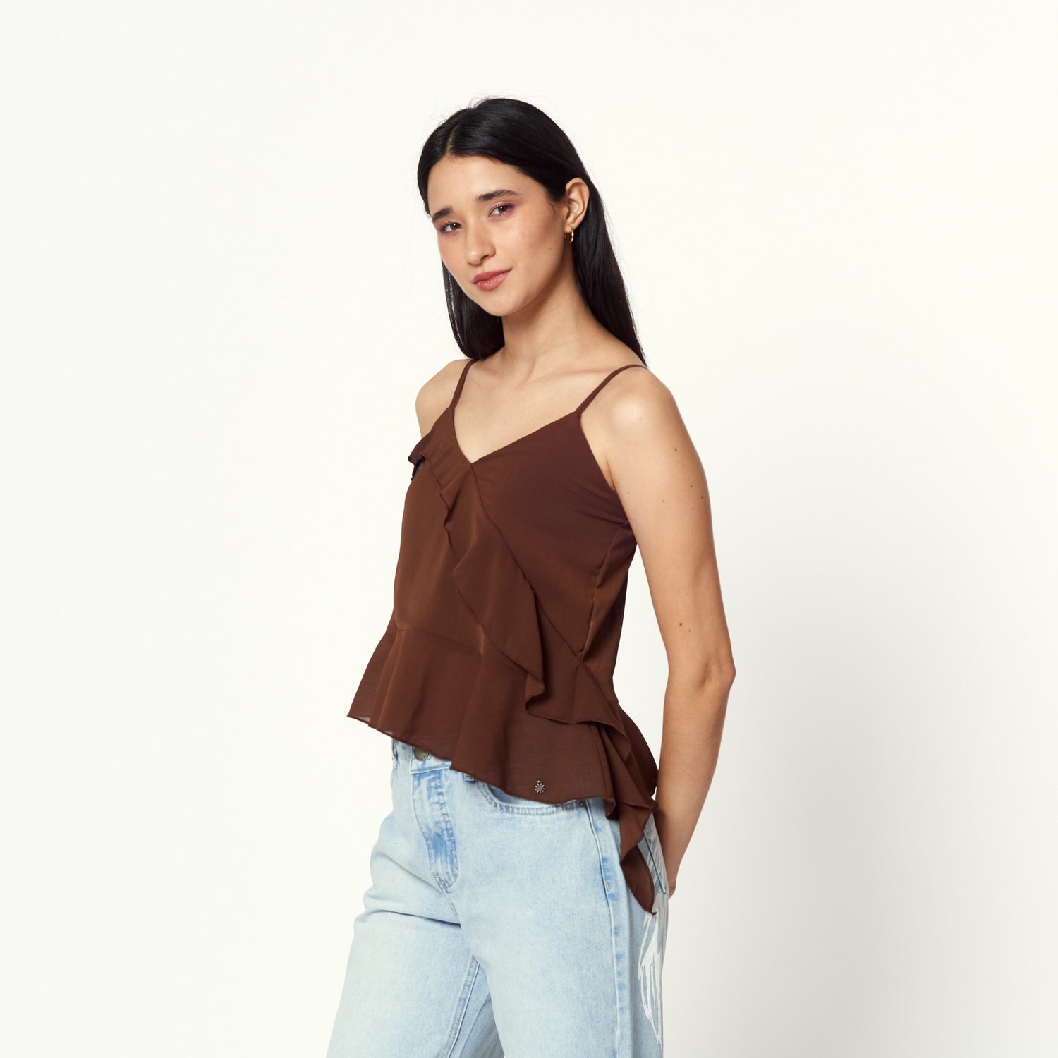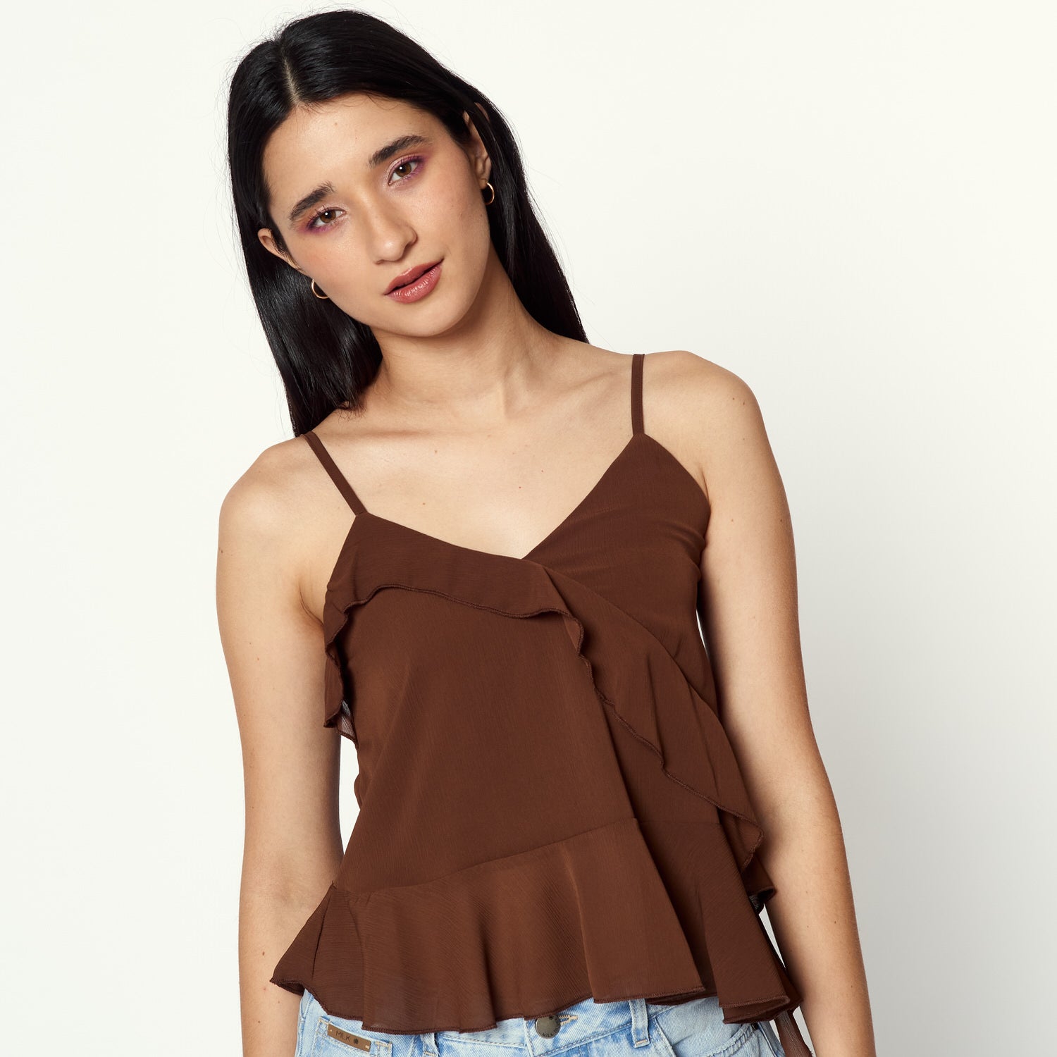 Un aire sofisticado. Blusa en gasa de textura ligera y caída delicada. El color marrón destaca por su elegancia, perfecta para un look casual-chic.