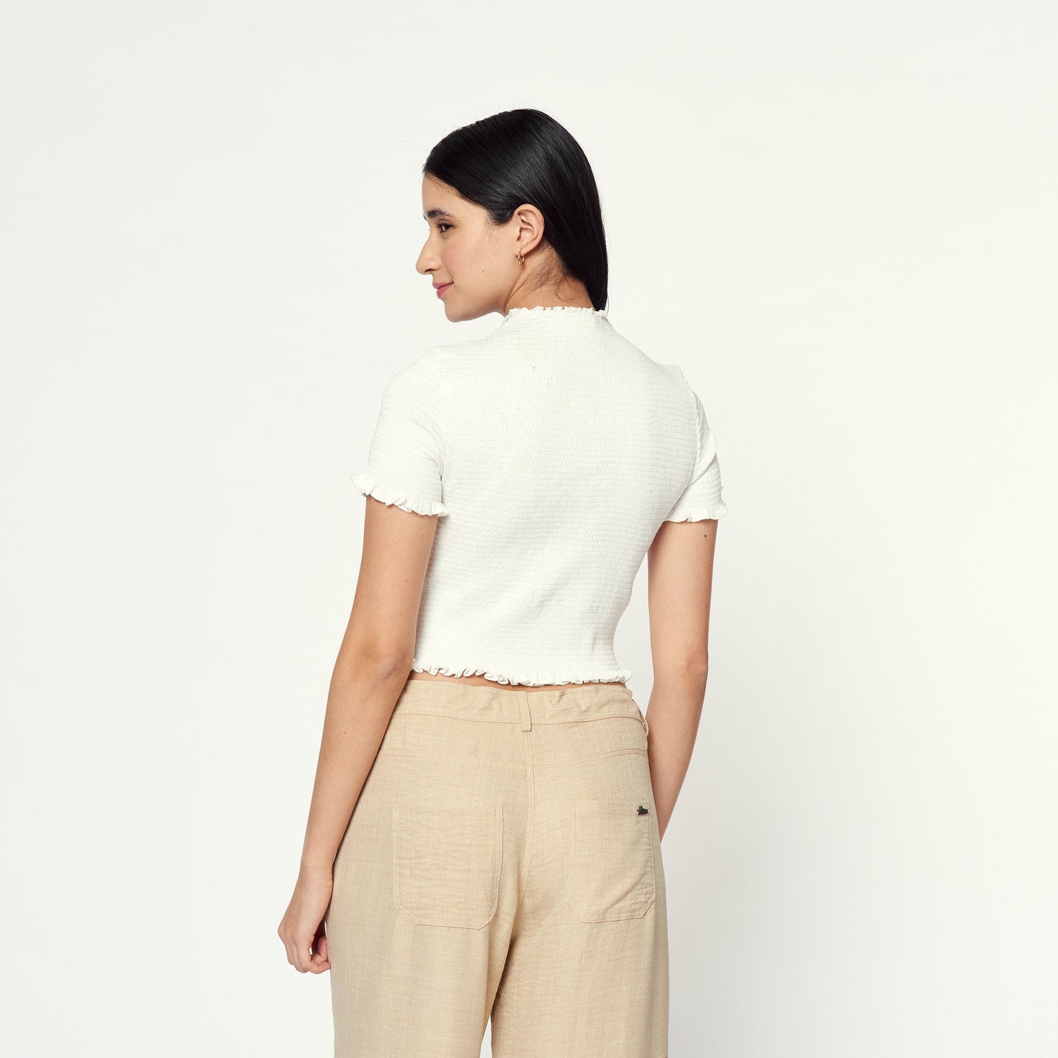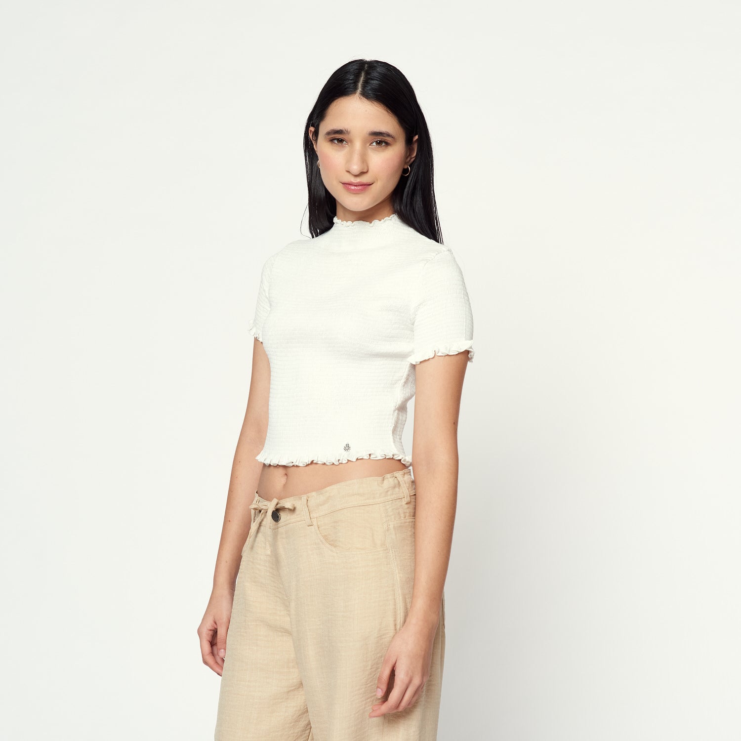 Minimalismo con estilo. La blusa Sephora en rayón hindú hueso es súper chic, con un diseño versátil que se convierte en un básico clave para armar looks modernos y frescos.