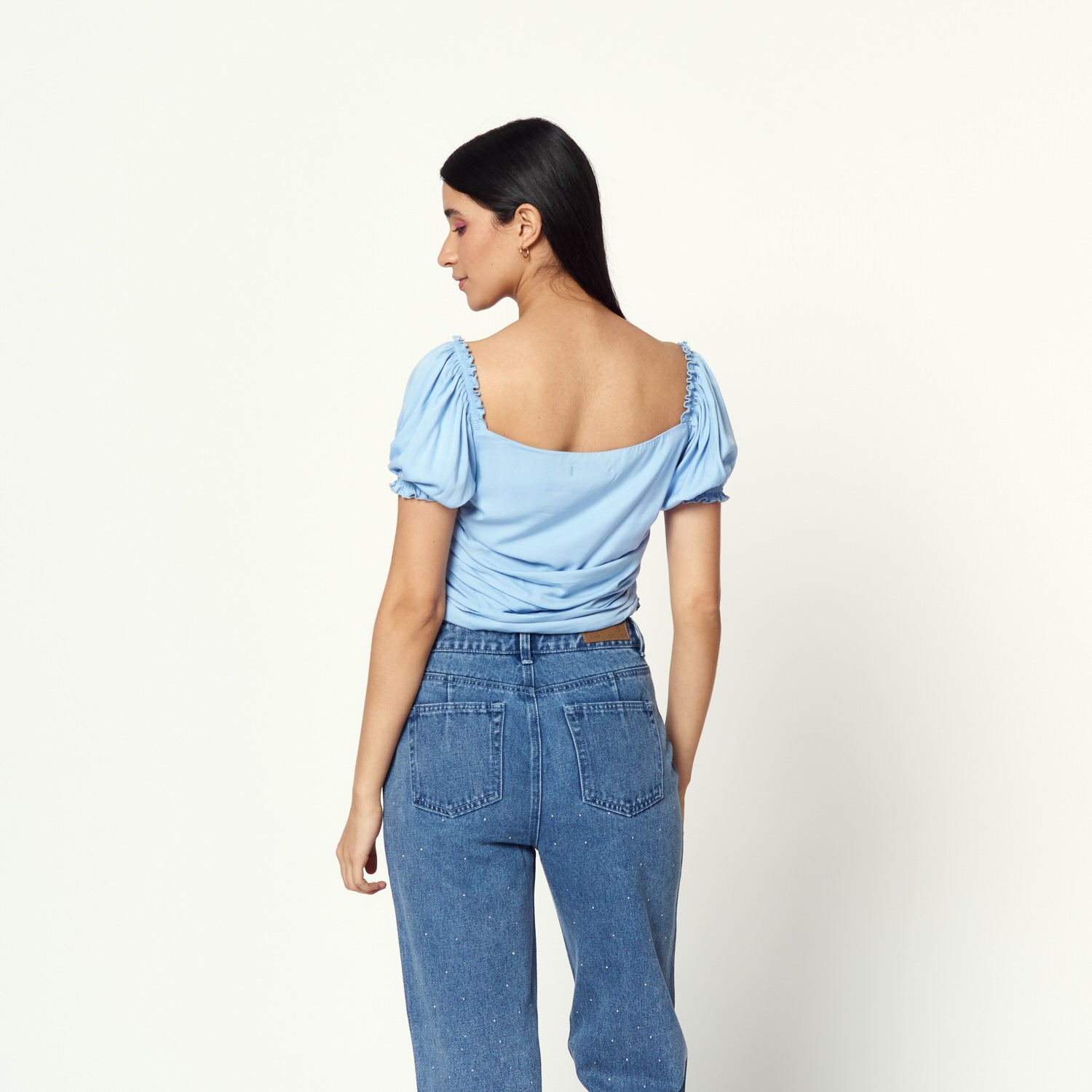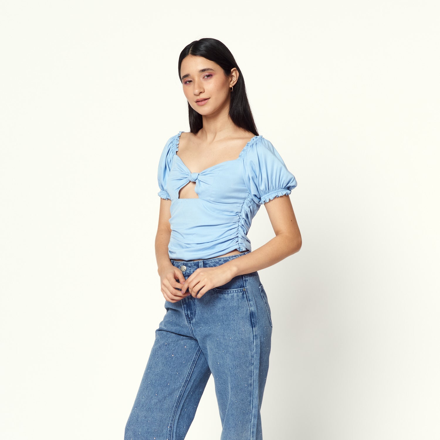¡Luz y movimiento! Blusa en rayón con fit relajado y caída fluida. El tono celeste ilumina y aporta frescura a tu look de temporada.