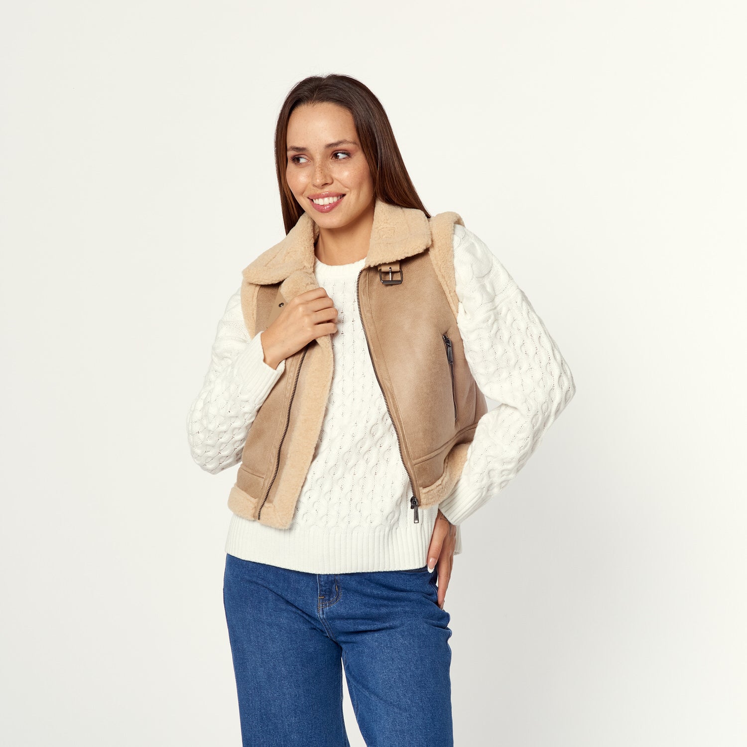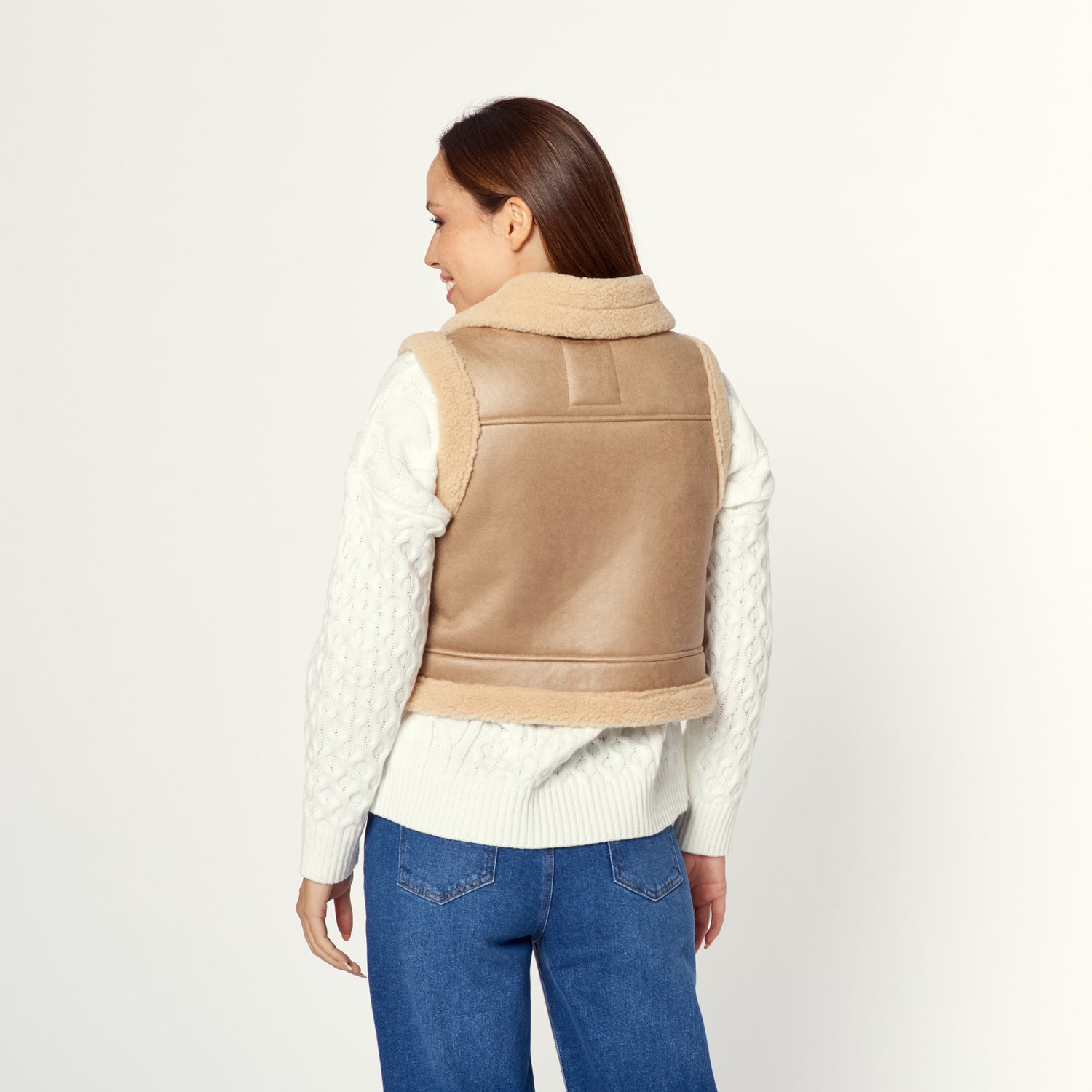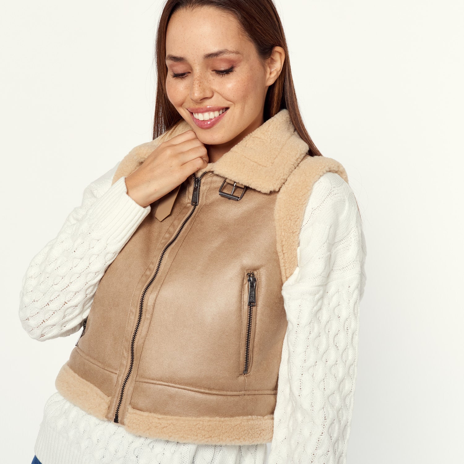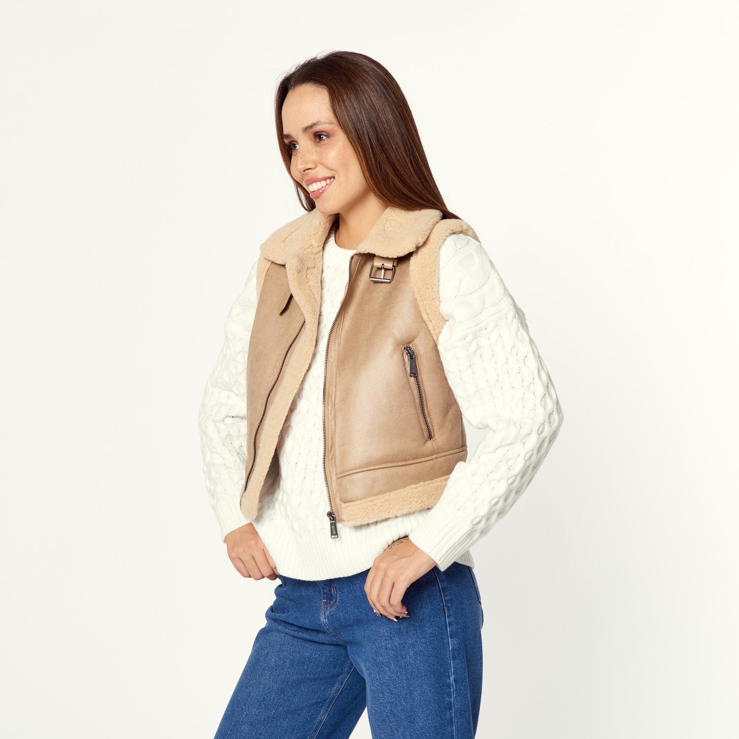Un chaleco de poliéster con textura en color topo con capucha. El Chaleco Cloud ofrece calidez y un estilo casual y cómodo para los días frescos.