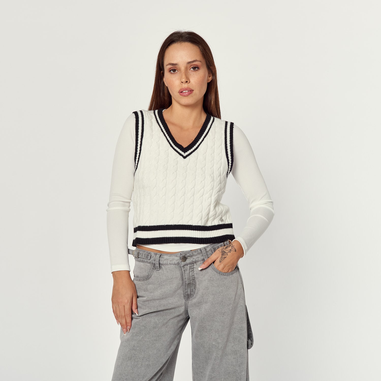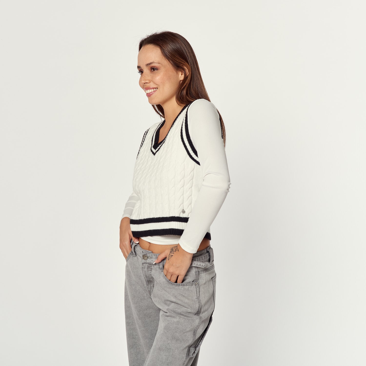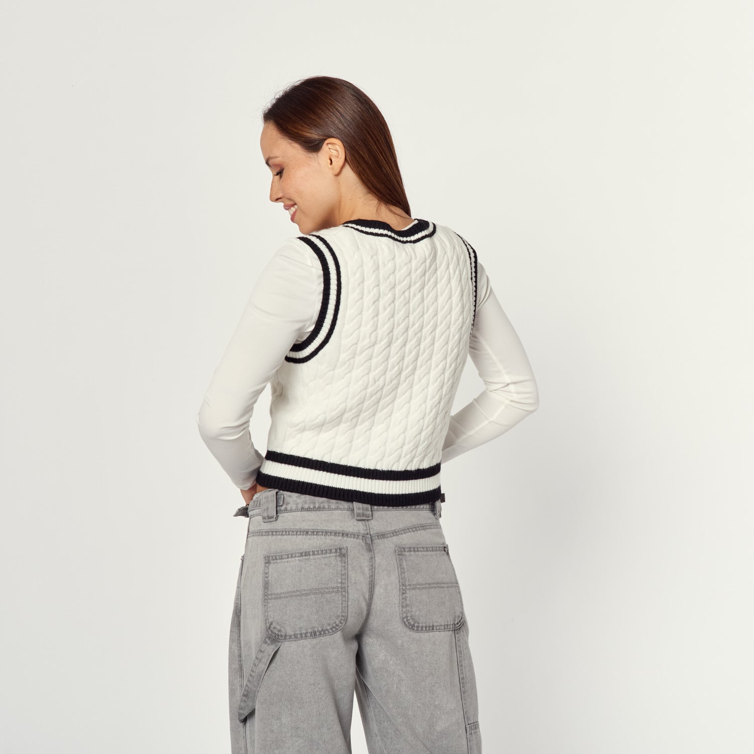 Un chaleco de tejido de punto en colores hueso con detalles en negro. El Chaleco Roberta añade un toque clásico y abrigador a tus looks de invierno. Su diseño sin mangas es perfecto para llevar sobre camisas o polos de manga larga.