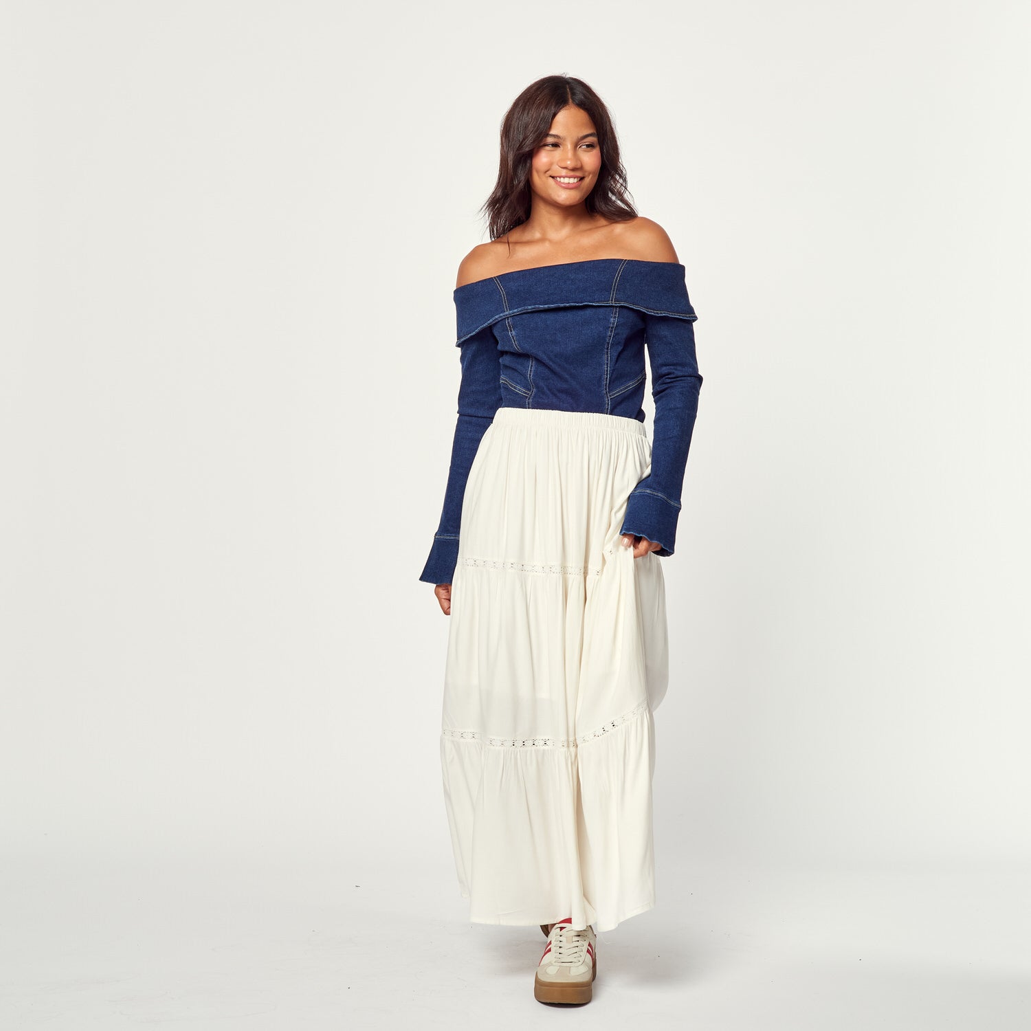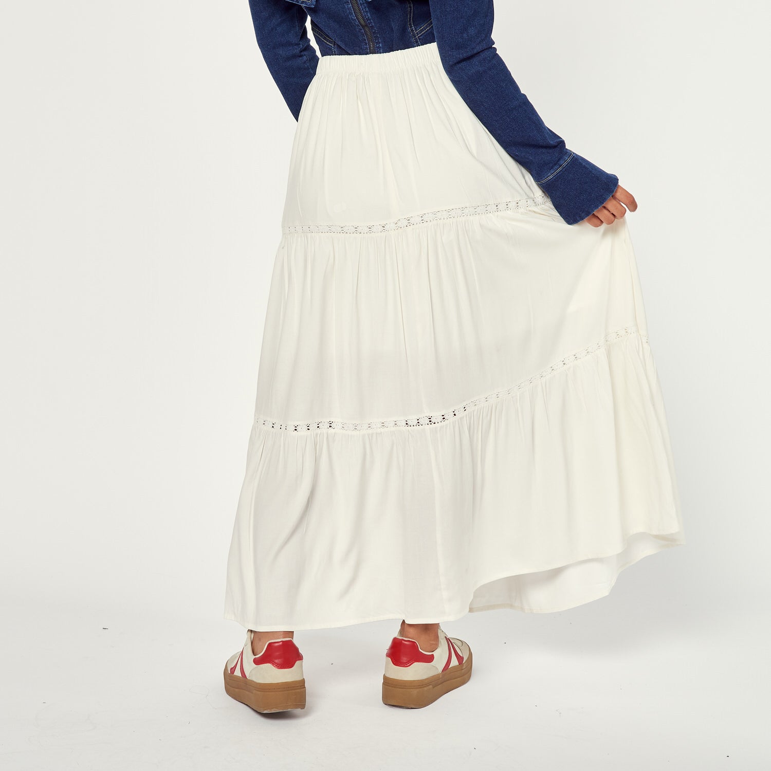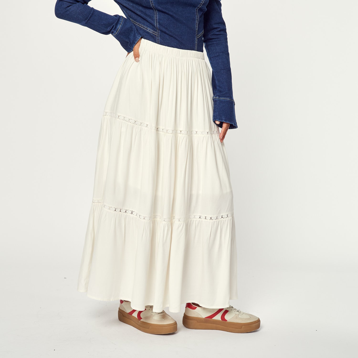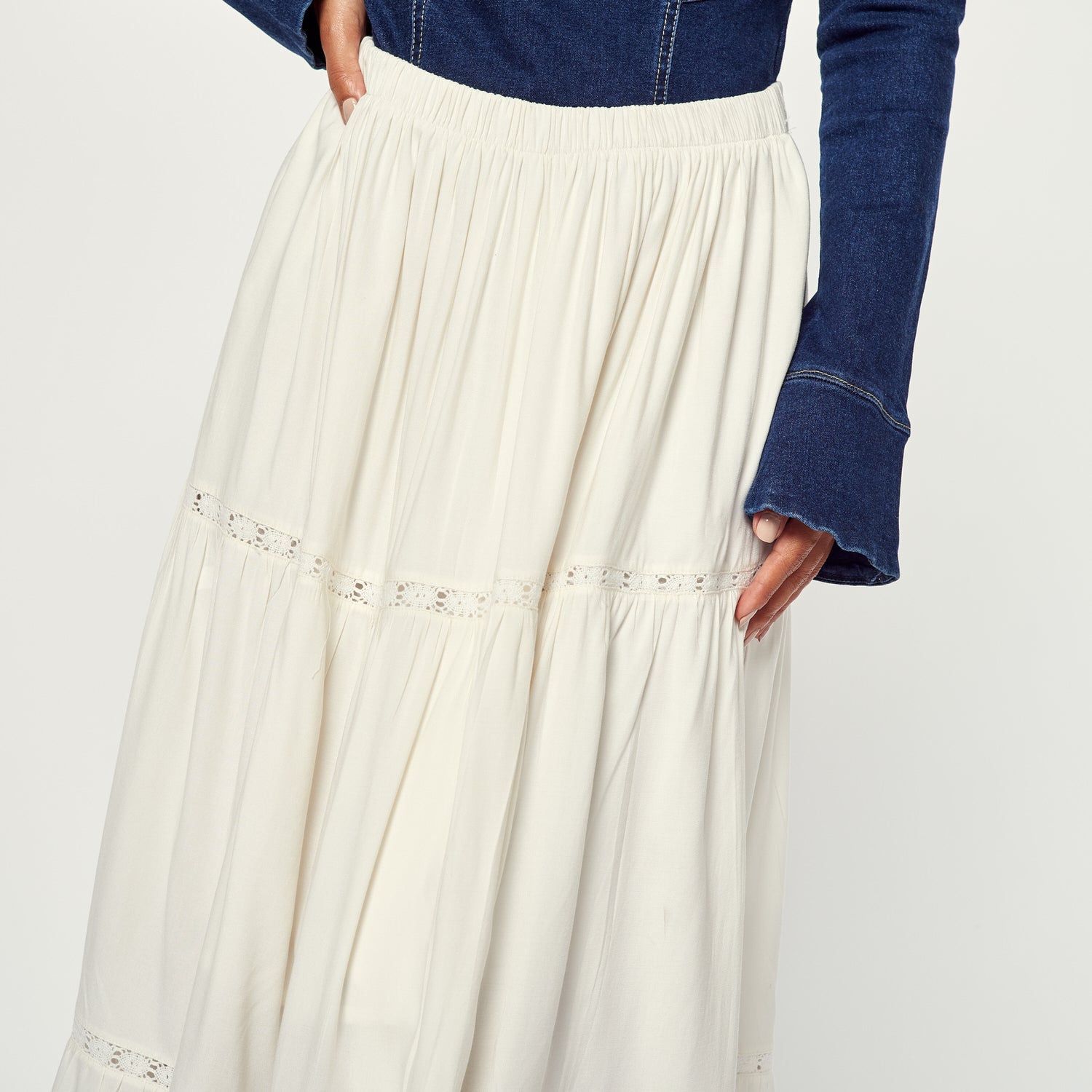 ¡Elegancia y fluidez! La Falda Mariel en chalis color hueso es perfecta para un look femenino y sofisticado. Úsala para una ocasión especial, una cena o para un look de día romántico.