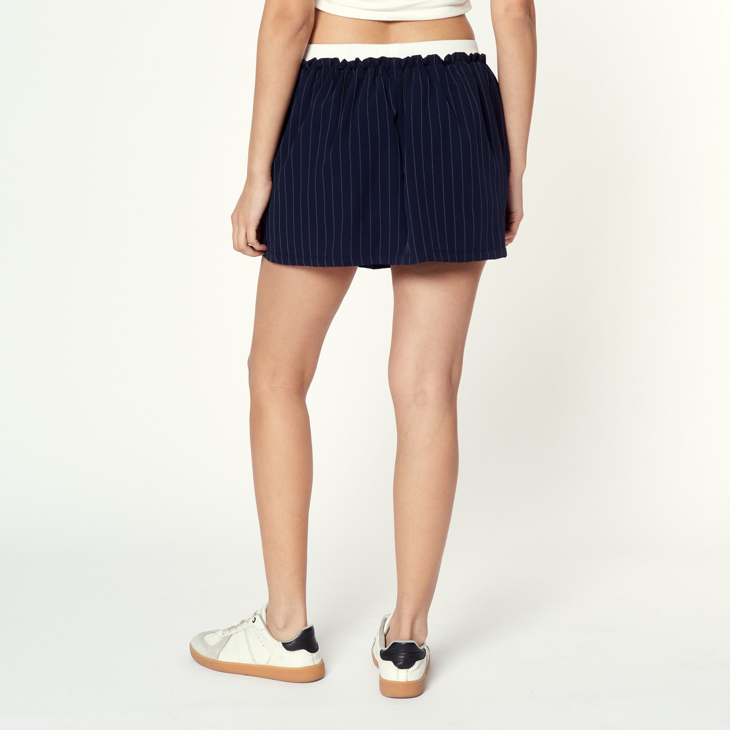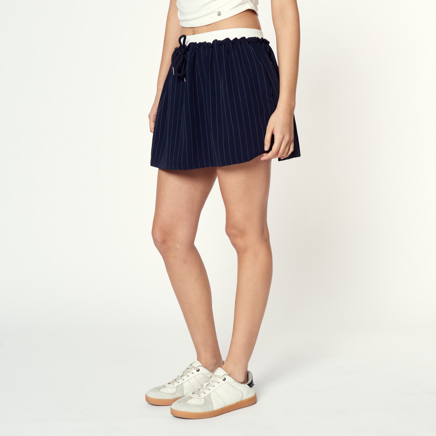 Un print diferente para un look con personalidad. La falda Sastrina en tela sastre con print a rayas es moderna y versátil, con un diseño estructurado que aporta estilo y frescura. Perfecta para combinar con polos básicos o blusas trendy.