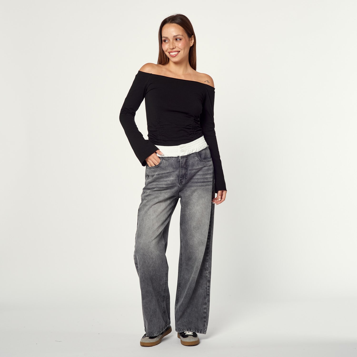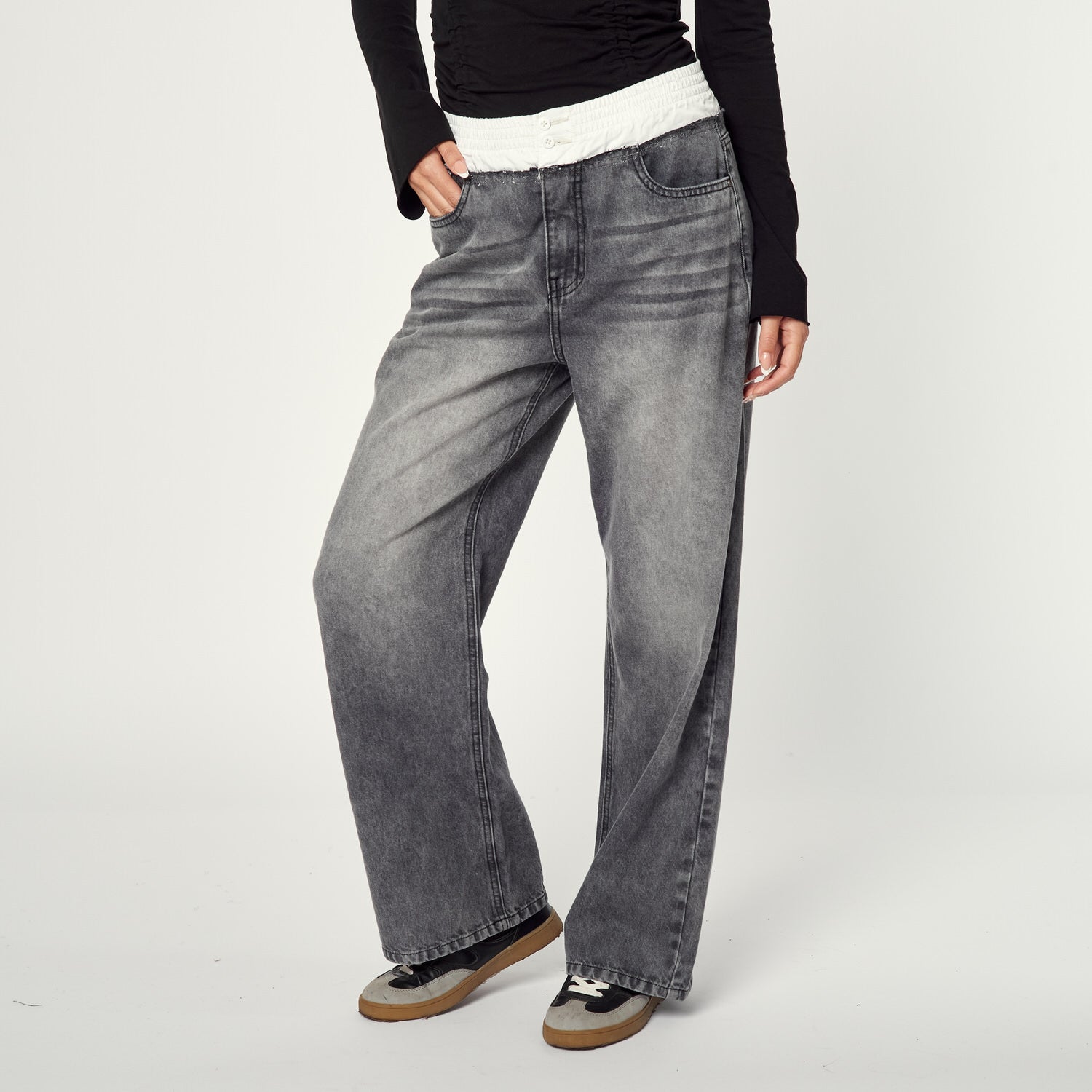 Con un aire edgy y muy actual, el tono plomo en denim rígido se convierte en tu favorito de temporada.