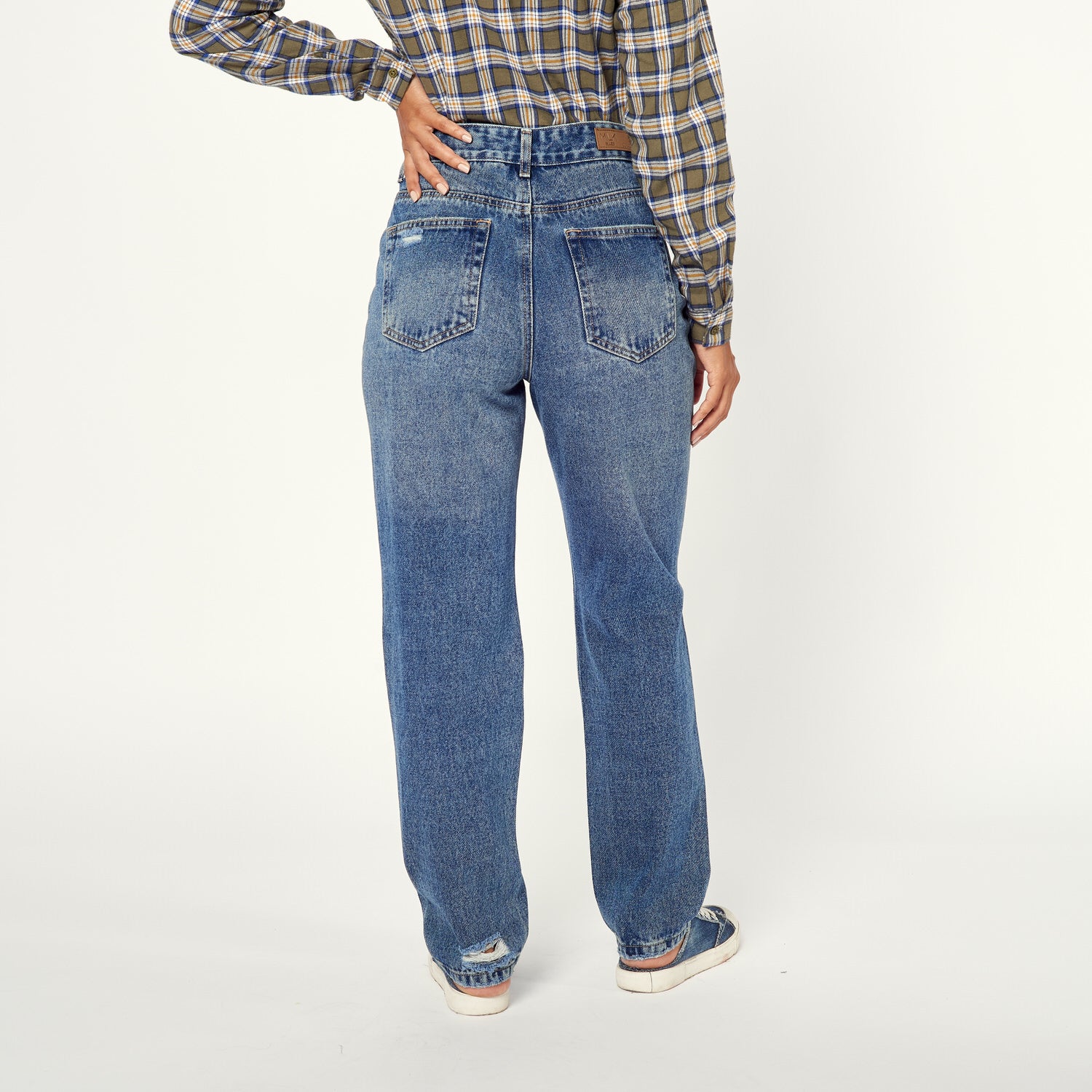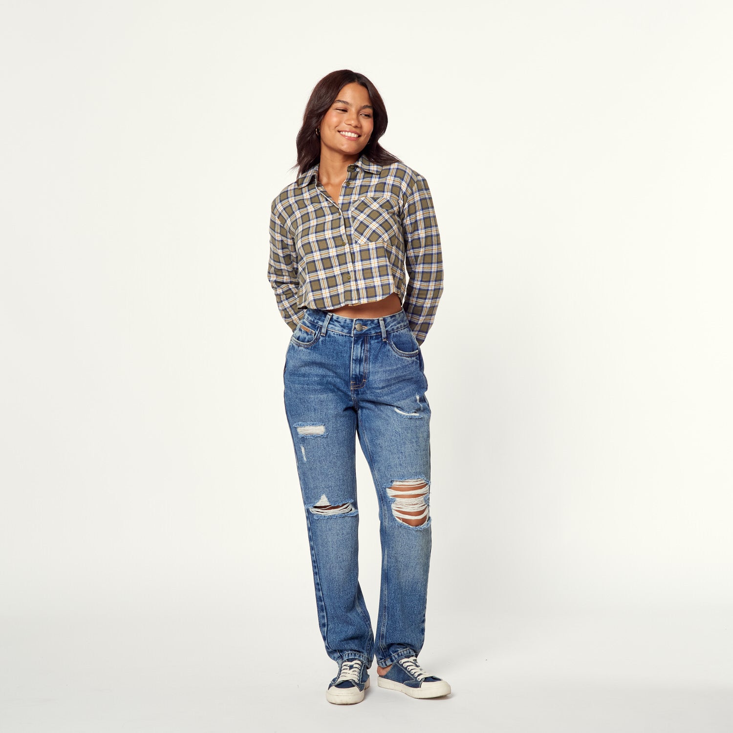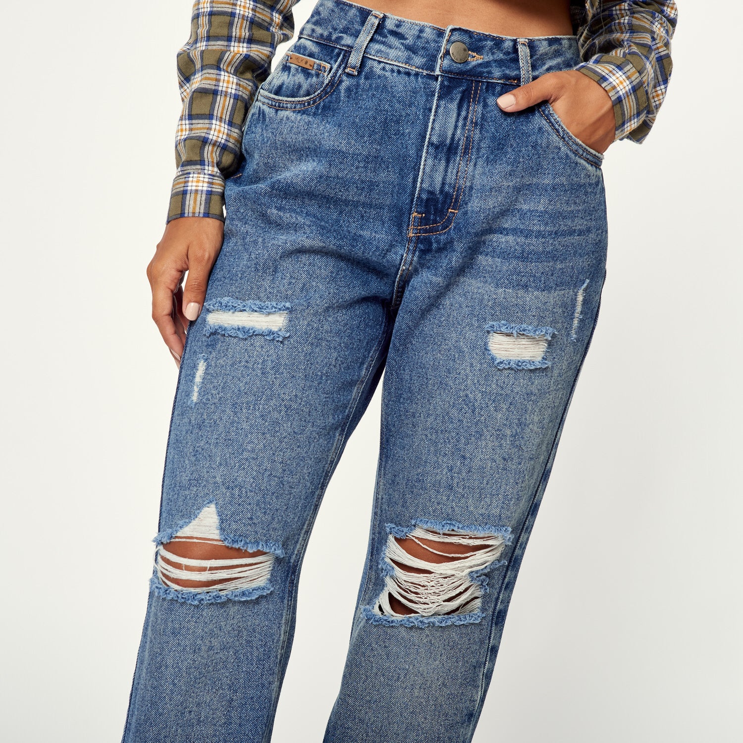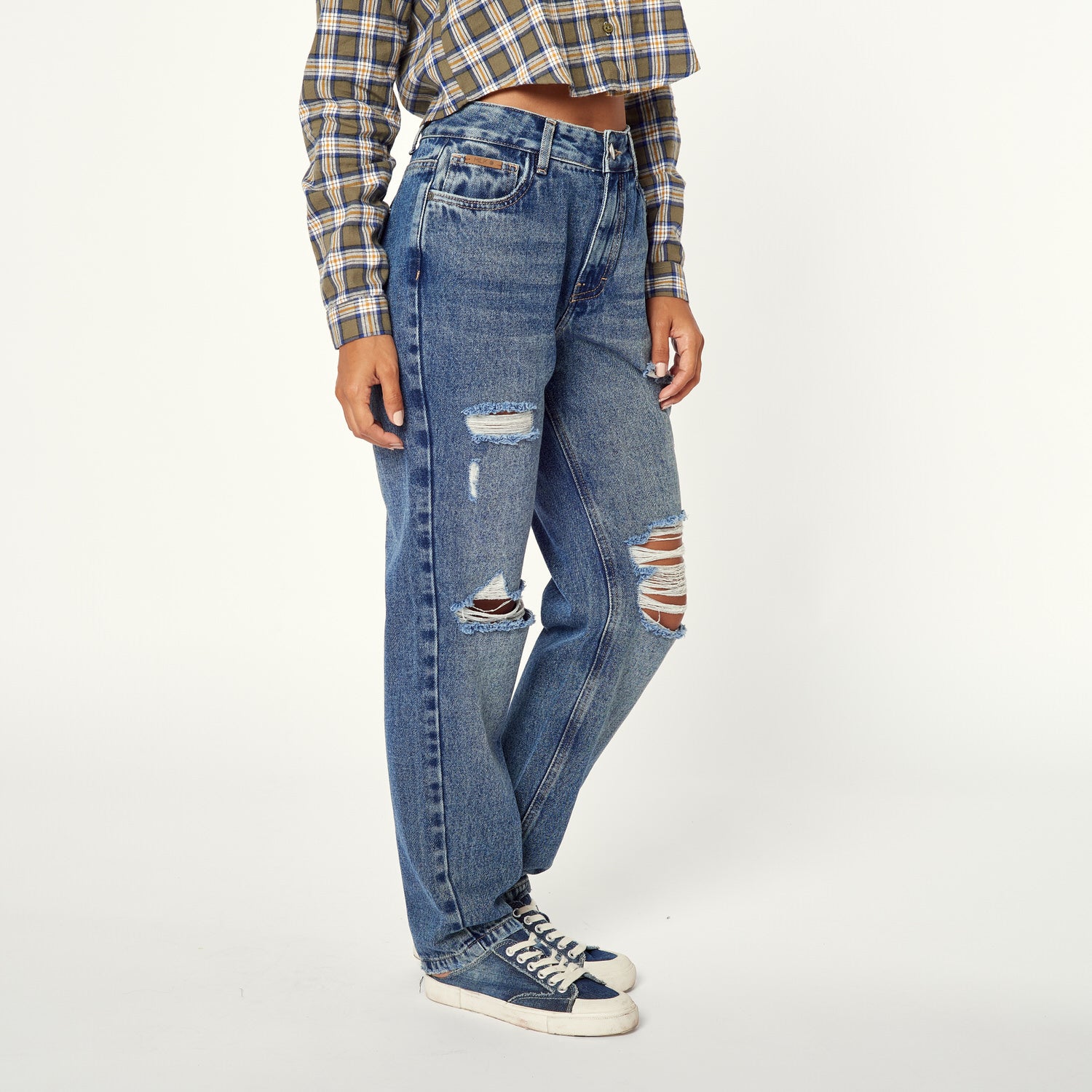¡Denim con actitud! El Jean Soledad en denim stretch azul tiene un diseño de corte roto y tiro bajo que te hará lucir increíble. Úsalo con un crop top y zapatillas para un look urbano y moderno o con una blusa estampada y sandalias para un estilo más bohemio.