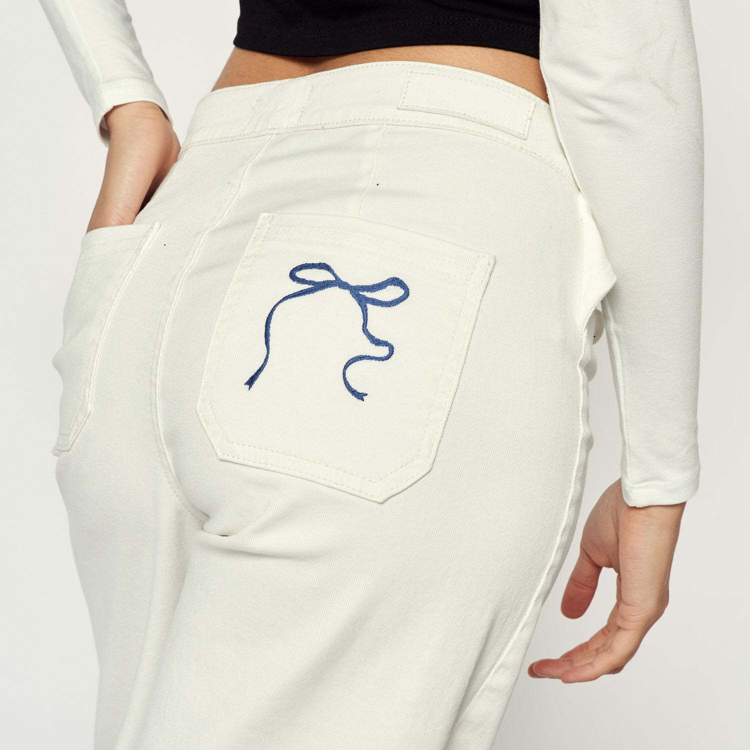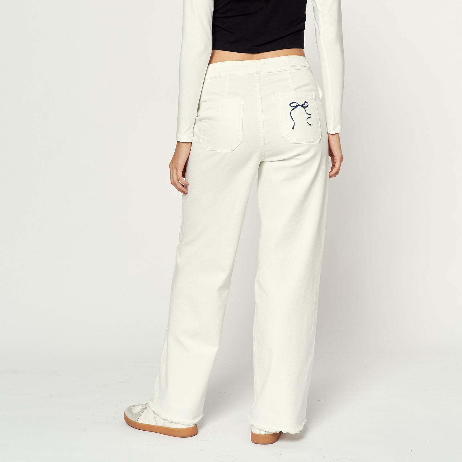 En bull denim comfort color hueso, el pantalón Preti estiliza con su corte recto y tiro alto. Combínalo con blusas o tops.