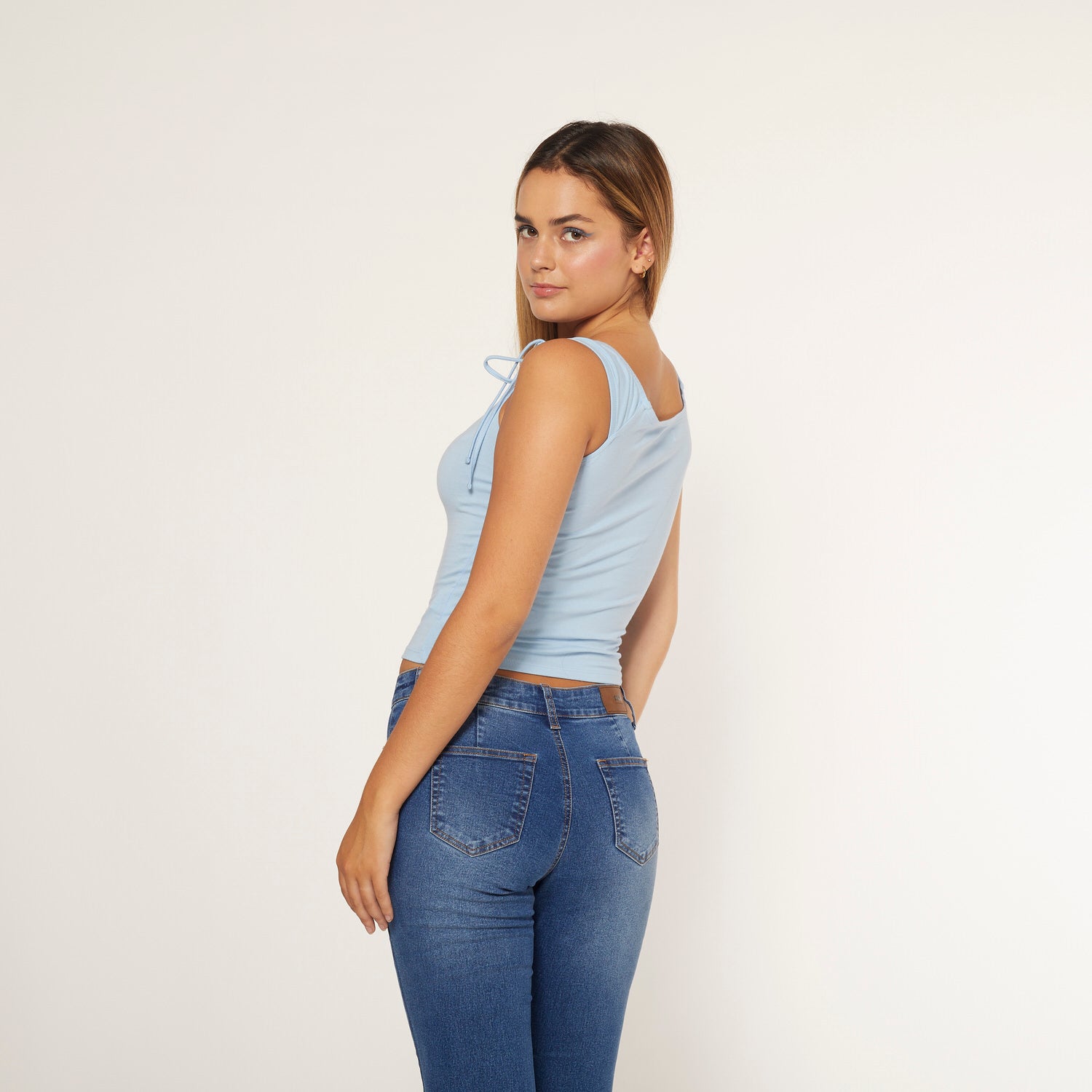 Polo manga cero, con tira amarrada en el delantero.